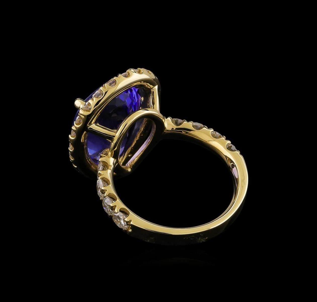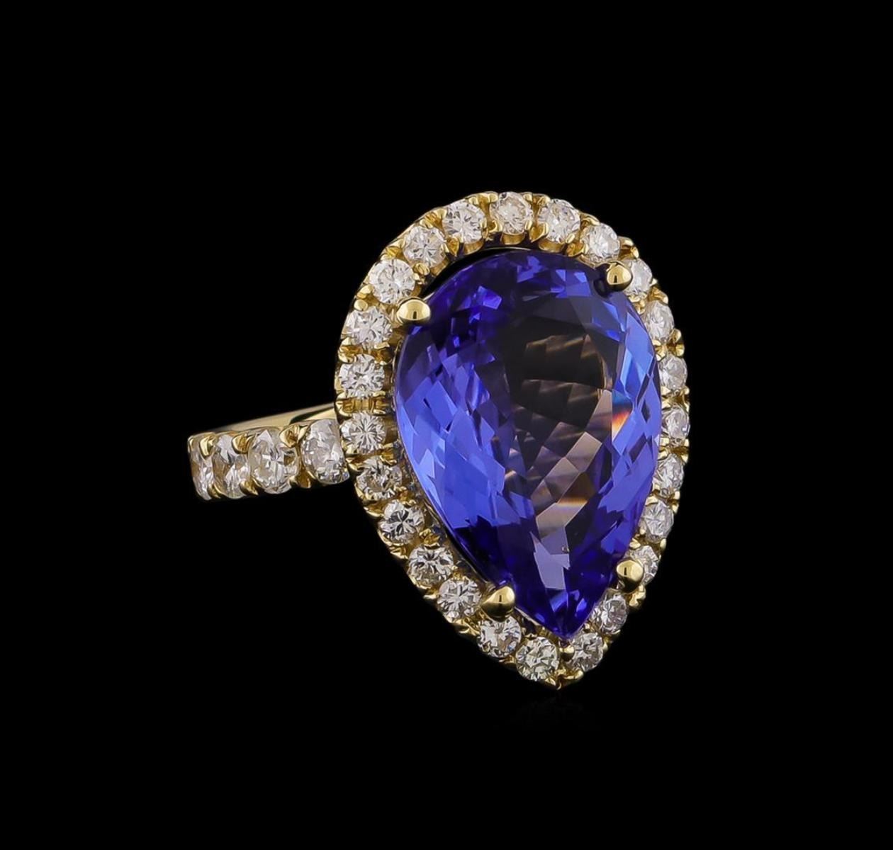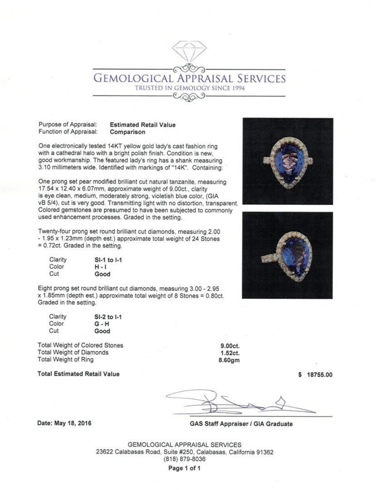 One electronically tested 14KT yellow gold lady's cast fashion ring with a cathedral halo with a bright polish finish. The featured lady's ring has a shank measuring 3.10 millimeters wide. Identified with markings of "14K". Condition is new, good workmanship. Containing: One prong set pear modified brilliant cut natural tanzanite, measuring 17.54 x 12.40 x 6.07mm, approximate weight of 9.00ct., clarity is eye clean, medium, moderately strong, violetish blue color, (GIA vB 5/4), cut is very good. Transmitting light with no distortion, transparent. Colored gemstones are presumed to have been subjected to commonly used enhancement processes. Graded in the setting. Twenty-Four prong set round brilliant cut diamonds, measuring 2.00 - 1.95 x 1.23mm (depth est.) approximate total weight of 24 Stones = 0.72ct. Graded in the setting. Clarity: SI-1 to I-1. Color: H - I. Cut Good Eight prong set round brilliant cut diamonds, measuring 3.00 - 2.95 x 1.85mm (depth est.) approximate total weight of 8 Stones = 0.80ct. Graded in the setting. Clarity: SI-2 to I-1. Color: G - Good. Total Weight of Colored Stones 9.00ct. Total Weight of Diamonds 1.52ct. Total Weight of Ring 8.60gm. GAS Appraised.