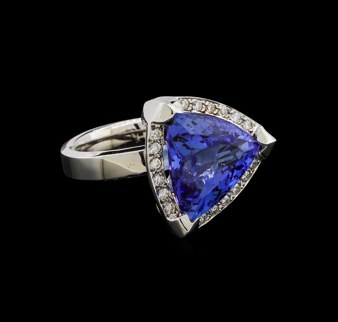One electronically tested 14KT white gold lady's cast fashion ring with a cathedral shank with a bright polish finish. The featured lady's ring has a shank measuring 3.80 millimeters wide. Identified with markings of '14K'. Condition is new, good workmanship. Containing: One prong set triangle modified brilliant cut natural tanzanite, measuring 14.20 x 13.80 x 7.70mm, (depth est.) approximate weight of 9.02ct., clarity is eye clean, medium dark, moderately strong, violetish blue color, (GIA vB 6/4), cut is very good. Transmitting light with no distortion, transparent. Colored gemstones are presumed to have been subjected to commonly used enhancement processes. Graded in the setting. Eighteen prong set round brilliant cut diamonds, measuring 1.50 - 1.45 x 0.92mm (depth est.) approximate total weight of 18 Stones = 0.22ct. Graded in the setting. Clarity SI-1 to SI-2. Color: H - I Cut Good. Total Weight of Colored Stones 9.02ct.. Total Weight of Diamonds 0.22ct.. Total Weight of Ring 11.40gm GAS Appraised.