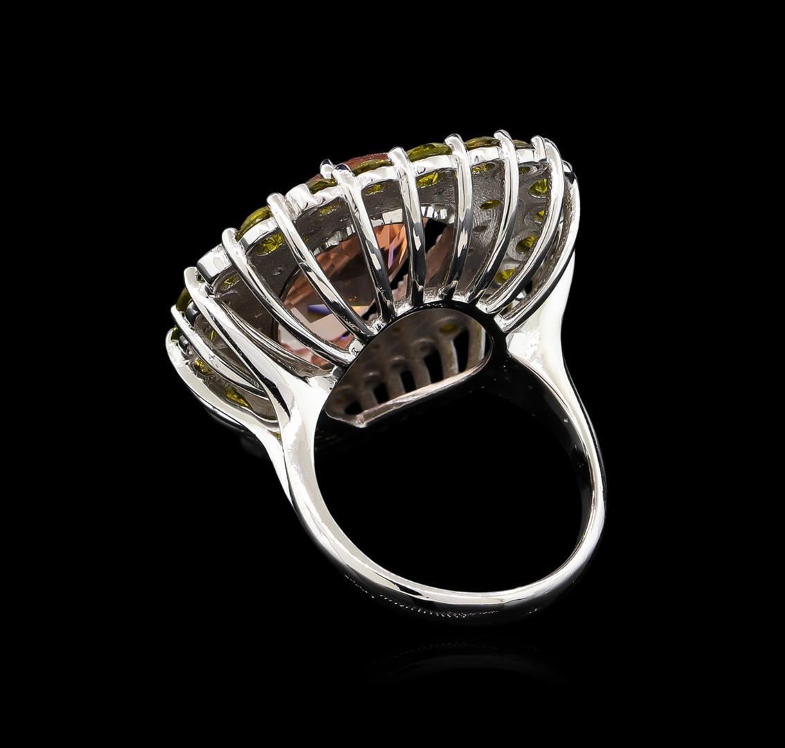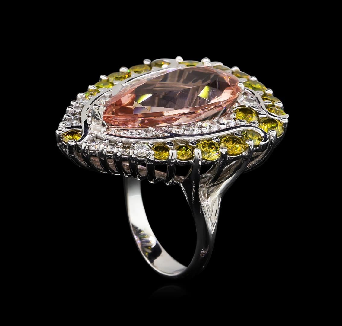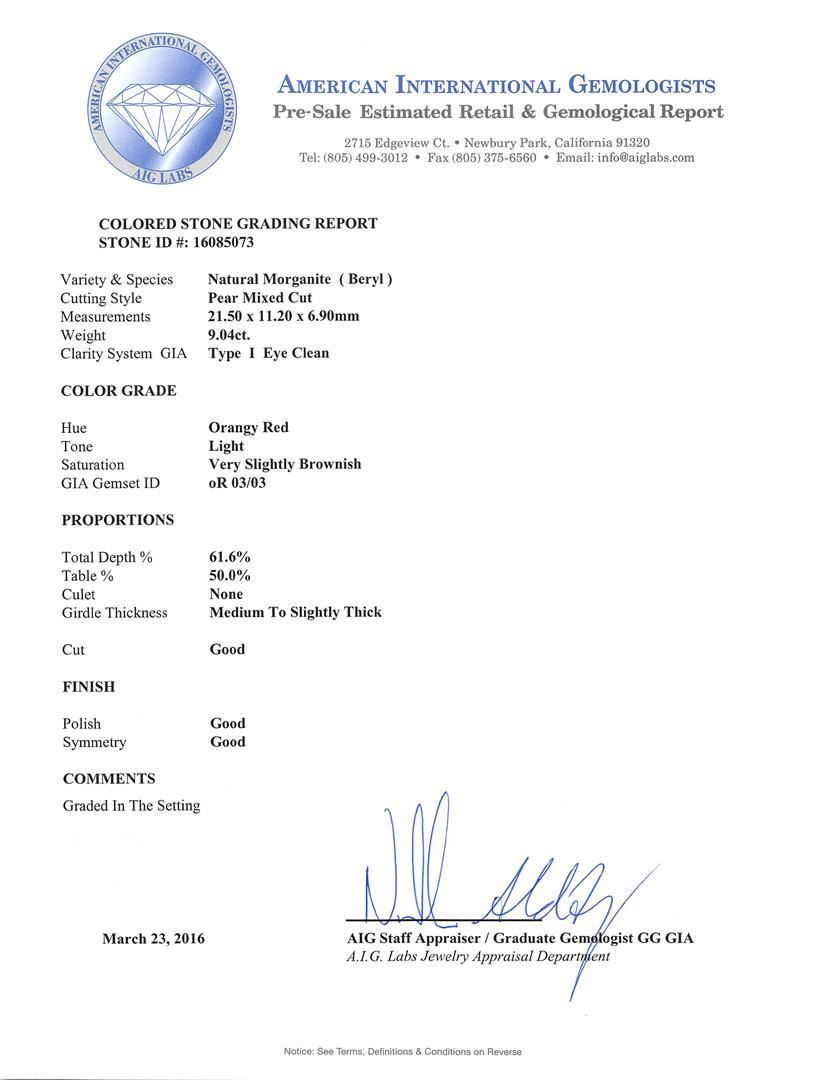 One electronically tested 18KT white gold ladies cast morganite and diamond ring with a bright polish finish. The featured morganite is set within a stylized yellow and white diamond bezel supported by a ribbed under gallery, completed by a three and one-half millimeter wide band. Identified with markings of "18K". Condition is new, good workmanship. Containing: One prong set pear mixed cut natural morganite, measuring 21.50 x 11.20 x 6.90mm, approximate weight of 9.04ct., clarity is eye clean, type I, light, very slightly brownish, orangy red color, (GIA oR 3/3), cut is good. Transmitting light with no distortion, transparent. Colored Stone Grading Report attached. Graded in the setting. Twenty prong set round brilliant cut diamonds approximate total weight of 20 Stones = 2.58ct. Indications of laboratory enhanced color. Color grade is an average for the group. Graded in the setting. Clarity: SI-2 to I-2 Twenty-Eight prong set round brilliant cut diamonds approximate total weight of 28 Stones = 0.76ct. Graded in the setting. Clarity: SI-2 to I-2. Color: F - H. Total Weight of Colored Stones 9.04ct. Total Weight of Diamonds 3.34ct. Total Weight of Ring 17.69gm. AIG Appraised.