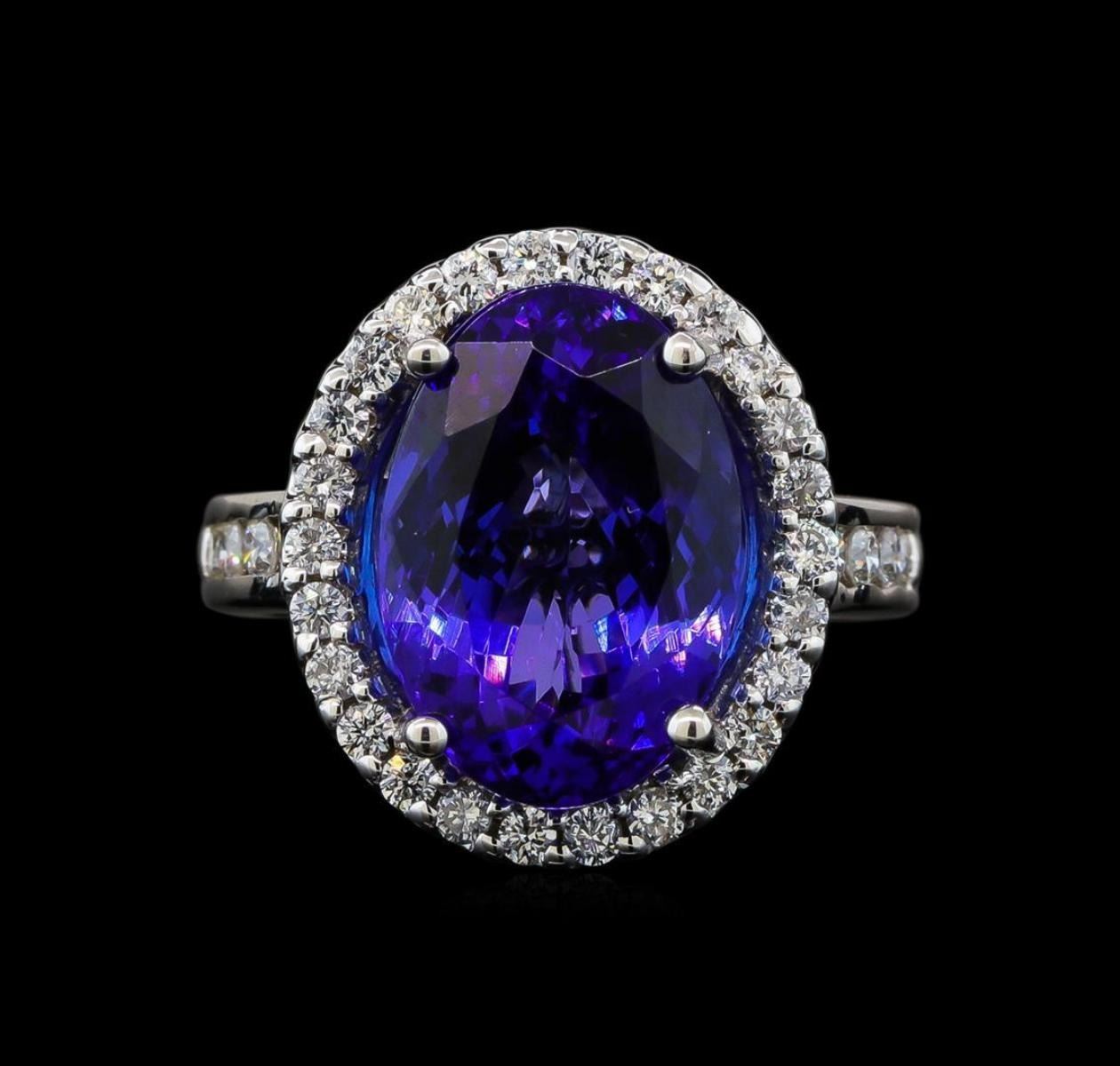 One electronically tested 14KT white gold lady's cast fashion ring with a basket halo with a bright polish finish. The featured lady's ring has a shank measuring 3.11 millimeters wide. Identified with markings of '14K'. Condition is new, good workmanship. Containing: One prong set oval modified brilliant cut natural tanzanite, measuring 14.67 x 10.06 x 7.69mm, (depth est.) 13%. bulge factor, approximate weight of 9.04ct., clarity is eye clean, medium dark, moderately strong, violetish blue color, (GIA vB 6/4), cut is very good. Transmitting light with no distortion, transparent. Colored gemstones are presumed to have been subjected to commonly used enhancement processes. Graded loose prior to setting in the GIA Laboratory, Report #2175665834. Ten channel set round brilliant cut diamonds, measuring 2.00 - 1.90 x 1.21mm (depth est.) approximate total weight of 10 Stones = 0.28ct. Graded in the setting. Clarity SI-1 to SI-2. Color: H - I Cut Good Twenty-Six prong set round brilliant cut diamonds, measuring 1.70 - 1.60 x 1.03mm (depth est.) approximate total weight of 26 Stones = 0.45ct. Graded in the setting. Clarity SI-1 to I-1. Color: H - I Cut Good. Total Weight of Colored Stones 9.04ct.. Total Weight of Diamonds 0.73ct.. Total Weight of Ring 8.50gm GAS Appraised.