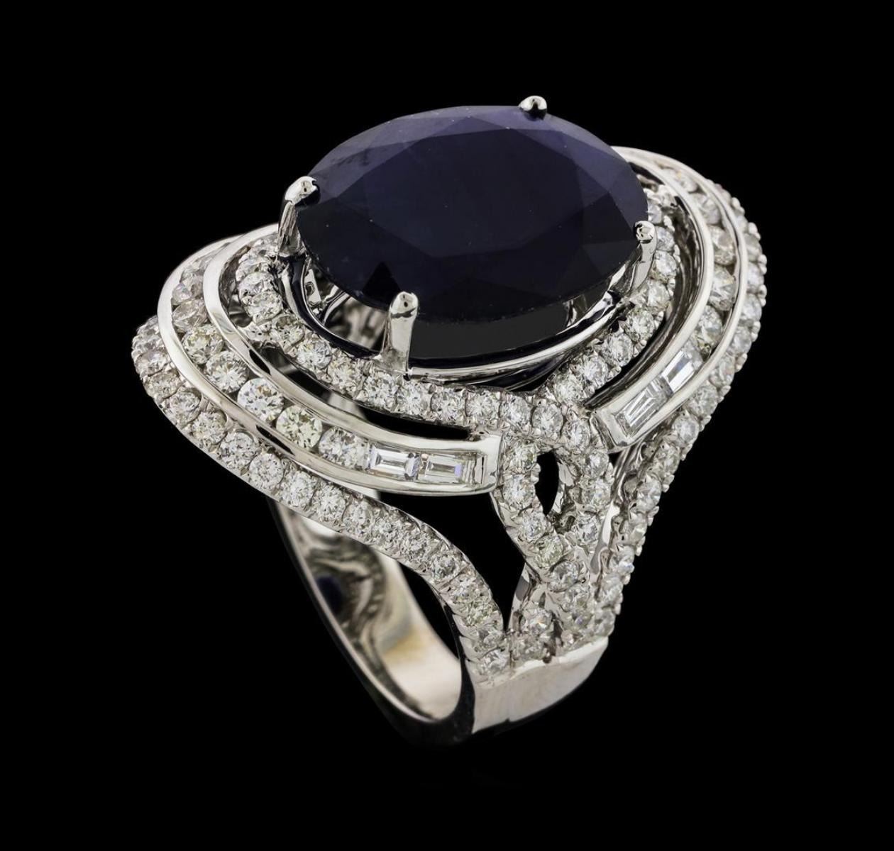 One 14KT White Gold Lady's Ring. Natural Burma Color Sapphire. No Heat. Containing: Gold & Weight: 14KT White Gold, 14.90 grams. Main Gemstones: Identity: Natural Sapphire. Carat Weight: 9.07 cts tw. Shape & Measurement: Oval Shape. Quality: Natural Sapphire. Burma Color. No Heat. Adjacent Gemstones: Identity: Natural Diamond. Shape: Round Brilliant Cut & Baguette Cut. Carat Weight: 2.50 cts tw. Quality: VS Clarity, E-F Color. All fine cutting and proportions. Total gemstones weight: 11.57 cts tw. RBGS Appraised.