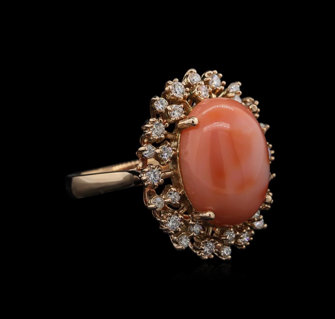 One ring featuring: 14KT rose gold weighing 6.48 grams containing one coral center stone with a total weight of 9.15ct and 30 diamonds with a total weight of 0.70 ct.