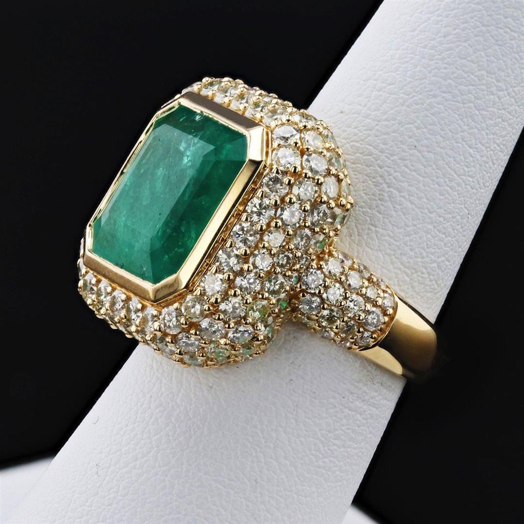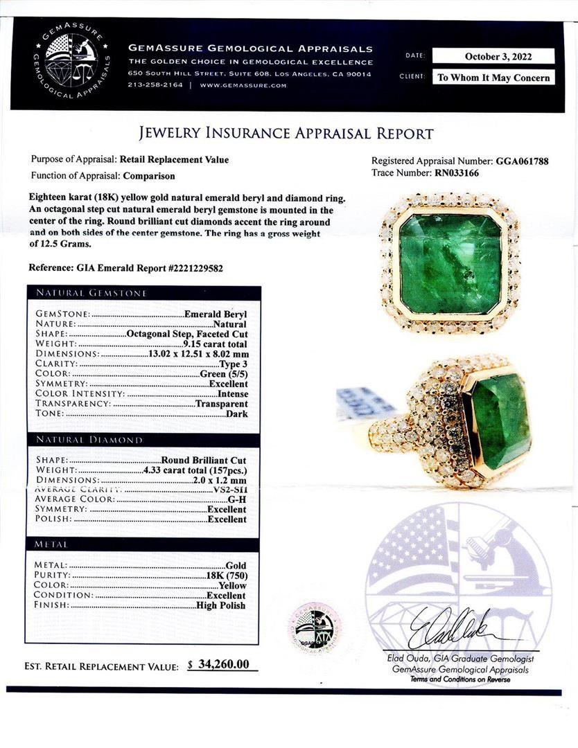 9.15ct Emerald and 4.33ctw Diamond 18K Yellow Gold Ring. Eighteen karat (18K) yellow gold natural emerald beryl and diamond ring. An octagonal step cut natural emerald beryl gemstone is mounted in the center of the ring. Round brilliant cut diamonds accent the ring around and on both sides of the center gemstone. The ring has a gross weight of 12.5 Grams. Reference: CIA Emerald Report 2221229582 *NATURAL GEMSTONE* GEMSTONE: Emerald Beryl NATURE: Natural SHAPE: Octagonal Step, Faceted Cut WEIGHT: 9.15 carat total DIMENSIONS: 13.02 x 12.51 x 8.02mm CLARITY: Type 3 COLOR: Green (5/5) COLOR INTENSITY: Intense TRANSPARENCY: Transparent TONE: Dark *NATURAL DIAMOND* SHAPE: Round Brilliant Cut WEIGHT: 4.33 carat total (157pcs.) AVERAGE CLARITY: VS2-SI1 AVERAGE COLOR: G-H SYMMETRY: Excellent POLISH: Excellent *METAL* METAL: Gold PURITY: 18K (750) COLOR: Yellow CONDITION: Excellent FINISH: High Polish