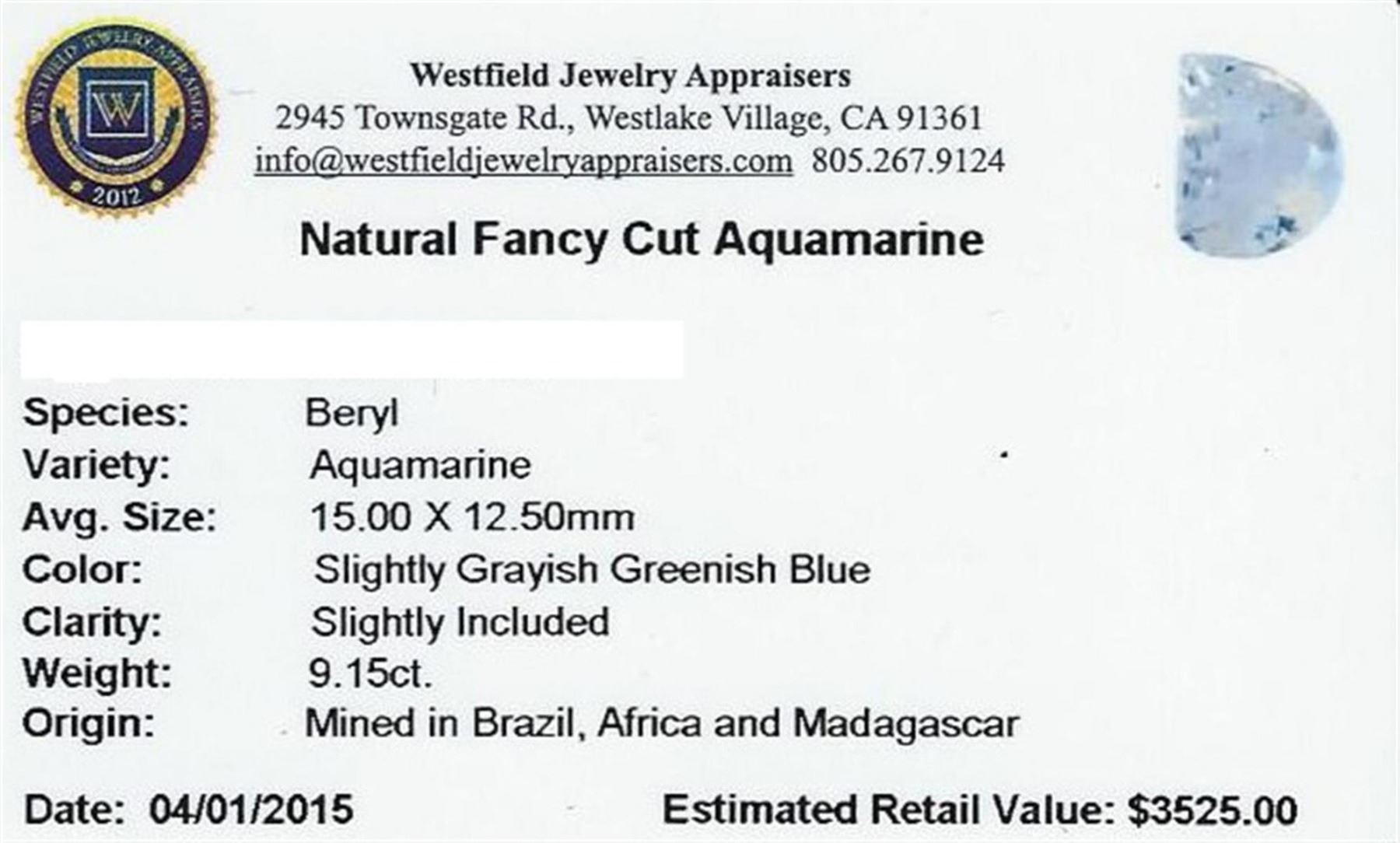 _x000D_One free-form mixed cut natural aquamarine exact weight 9.15ct., clarity is slightly included, type I, medium light, very slightly grayish, very slightly greenish blue color, (GIA vslgB 4/3), cut is good. Westfield Appraised.