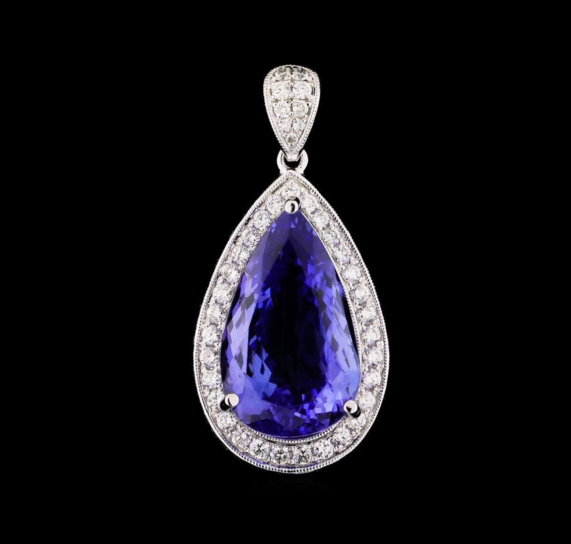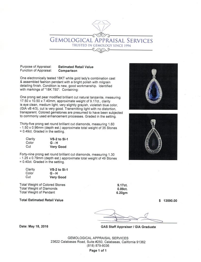 One electronically tested 18KT white gold lady's combination cast & assembled fashion pendant with a bright polish with milgrain detailing finish. Identified with markings of "18K 750". Condition is new, good workmanship. Containing: One prong set pear modified brilliant cut natural tanzanite, measuring 17.50 x 10.50 x 7.40mm, approximate weight of 9.17ct., clarity is eye clean, medium light, very slightly grayish, violetish blue color, (GIA vB 4/3), cut is very good. Transmitting light with no distortion, transparent. Colored gemstones are presumed to have been subjected to commonly used enhancement processes. Graded in the setting. Thirty-Five prong set round brilliant cut diamonds, measuring 1.60 - 1.50 x 0.96mm (depth est.) approximate total weight of 35 Stones = 0.49ct. Graded in the setting. Clarity: VS-2 to SI-1. Color: G - Very Good Forty-Nine prong set round brilliant cut diamonds, measuring 1.30 - 1.25 x 0.79mm (depth est.) approximate total weight of 49 Stones = 0.40ct. Graded in the setting. Clarity: VS-2 to SI-1. Color: G - Very Good. Total Weight of Colored Stones 9.17ct. Total Weight of Diamonds 0.89ct. Total Weight of Pendant 6.20gm. GAS Appraised at $13,590.00.