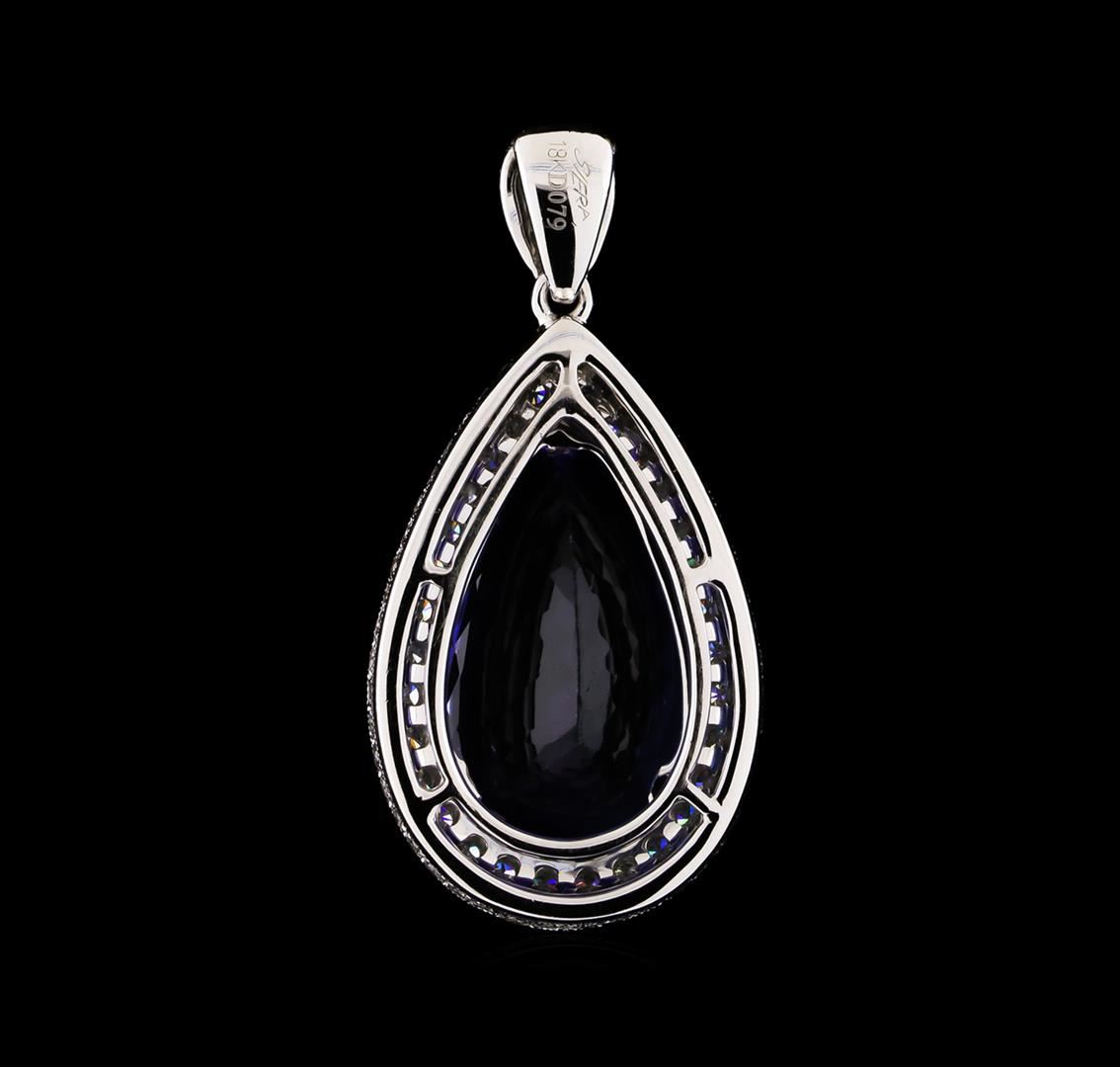 One electronically tested 18KT white gold lady's combination cast & assembled fashion pendant with a bright polish with milgrain detailing finish. Identified with markings of "18K 750". Condition is new, good workmanship. Containing: One prong set pear modified brilliant cut natural tanzanite, measuring 17.50 x 10.50 x 7.40mm, approximate weight of 9.17ct., clarity is eye clean, medium light, very slightly grayish, violetish blue color, (GIA vB 4/3), cut is very good. Transmitting light with no distortion, transparent. Colored gemstones are presumed to have been subjected to commonly used enhancement processes. Graded in the setting. Thirty-Five prong set round brilliant cut diamonds, measuring 1.60 - 1.50 x 0.96mm (depth est.) approximate total weight of 35 Stones = 0.49ct. Graded in the setting. Clarity: VS-2 to SI-1. Color: G - Very Good Forty-Nine prong set round brilliant cut diamonds, measuring 1.30 - 1.25 x 0.79mm (depth est.) approximate total weight of 49 Stones = 0.40ct. Graded in the setting. Clarity: VS-2 to SI-1. Color: G - Very Good. Total Weight of Colored Stones 9.17ct. Total Weight of Diamonds 0.89ct. Total Weight of Pendant 6.20gm.