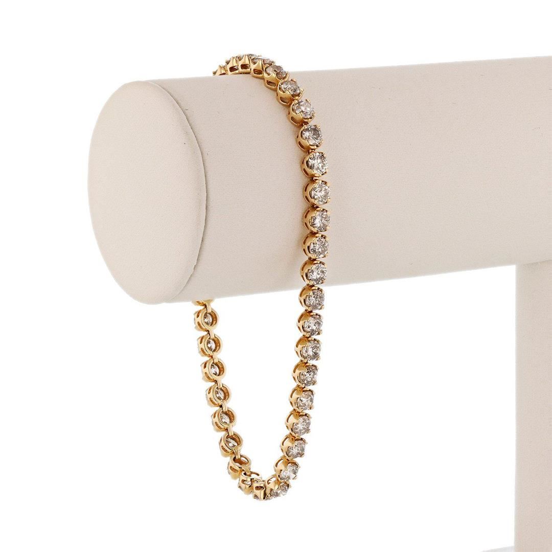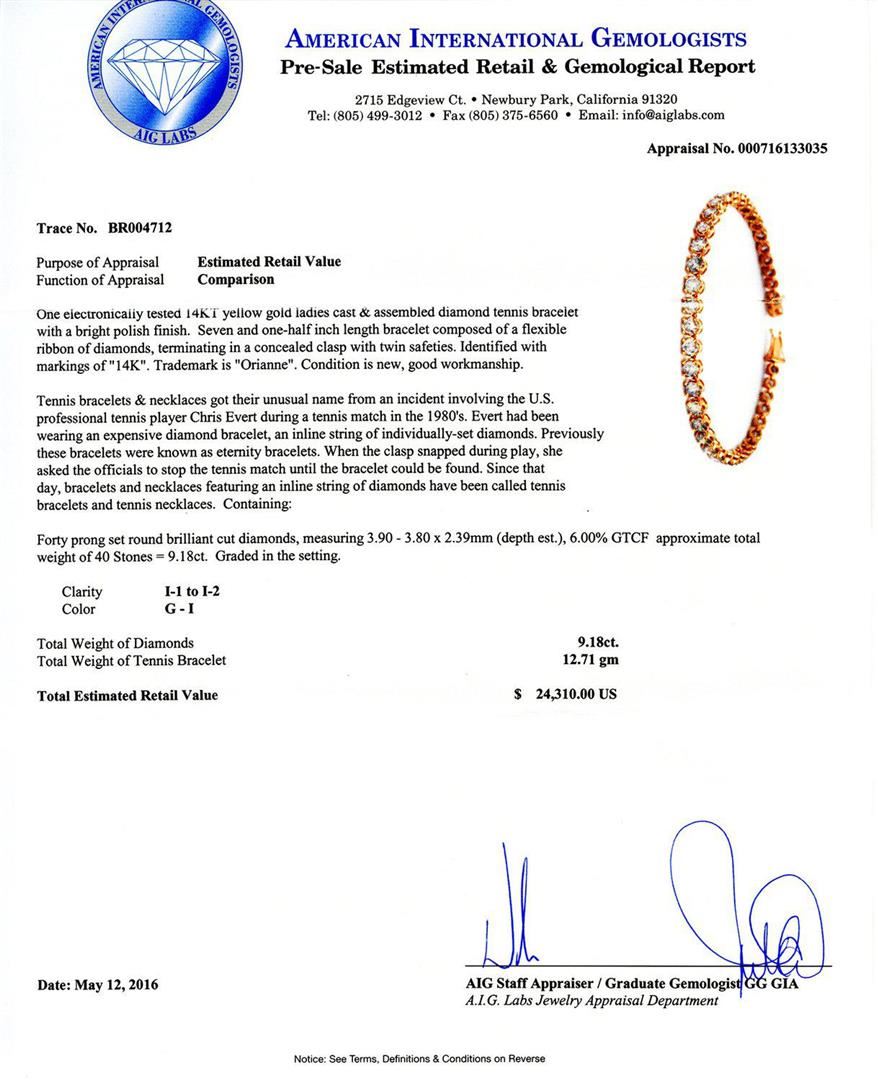 One electronically tested 14K yellow gold ladies cast and assembled diamond tennis bracelet with a bright polish finish. Seven and one-half inch length bracelet composed of a flexible ribbon of diamonds, terminating in a concealed clasp with twin safeties. Identified with markings of "14K". Trademark is "Orianne". Condition is new, good workmanship. Tennis bracelets and necklaces got their unusual name from an incident involving the U.S. professional tennis player Chris Evert during a tennis match in the 1980's. Evert had been wearing an expensive diamond bracelet, an inline string of individually-set diamonds. Previously these bracelets were known as eternity bracelets. When the clasp snapped during play, she asked the officials to stop the tennis match until the bracelet could be found. Since that day, bracelets and necklaces featuring an inline string of diamonds have been called tennis bracelets and tennis necklaces. Forty prong set round brilliant cut diamonds, measuring 3.90 - 3.80 x 2.39mm (depth est.), 6.00% GTCF approximate total weight of 40 Stones = 9.18ct. Graded in the setting. Clarity I-1 to I-2 Color G-I Total Weight of Diamonds 9.18ct. Total Weight of Tennis Bracelet 12.71 gm