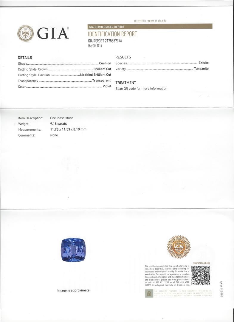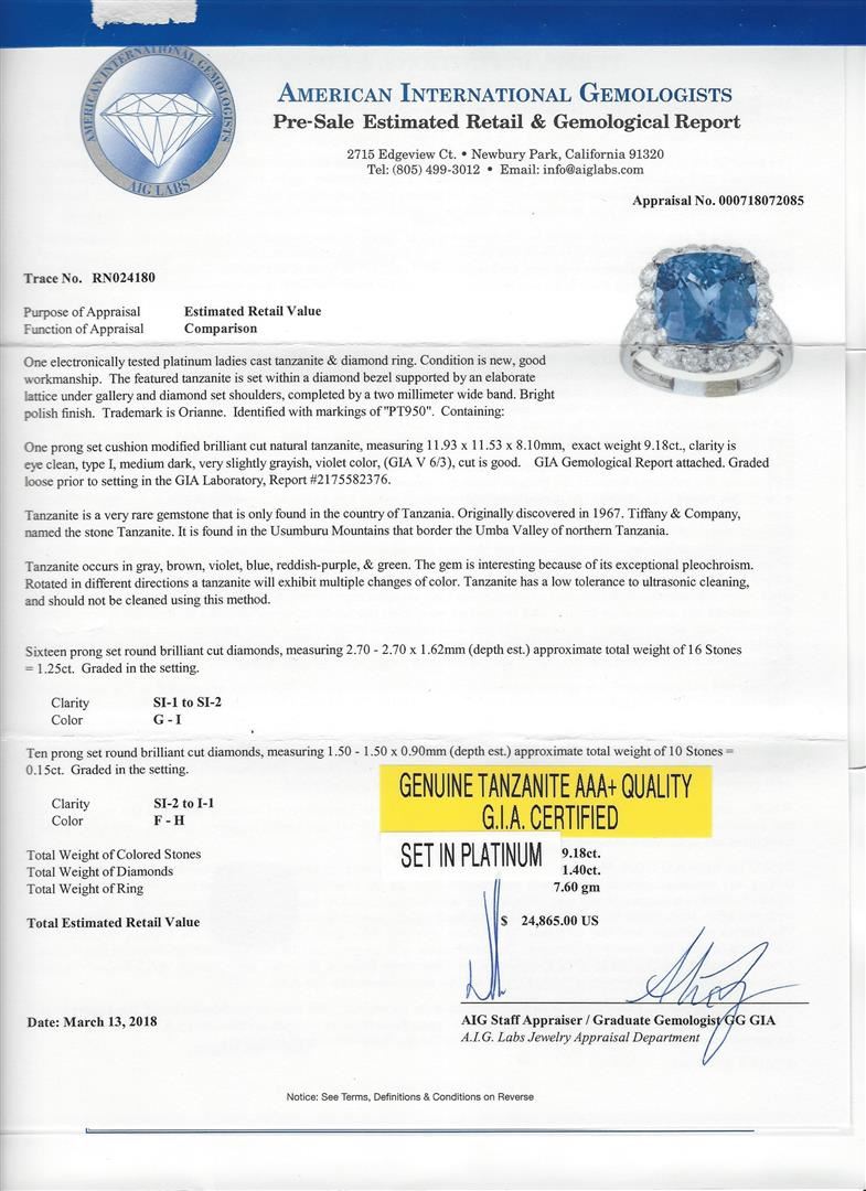 One 9.18ct Tanzanite and Diamond Ring - Platinum. AIG certified. See Appraisal for more details. AIG Appraised.