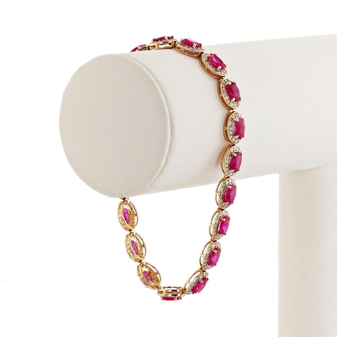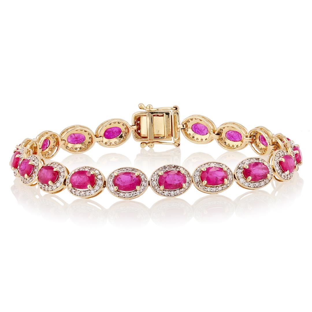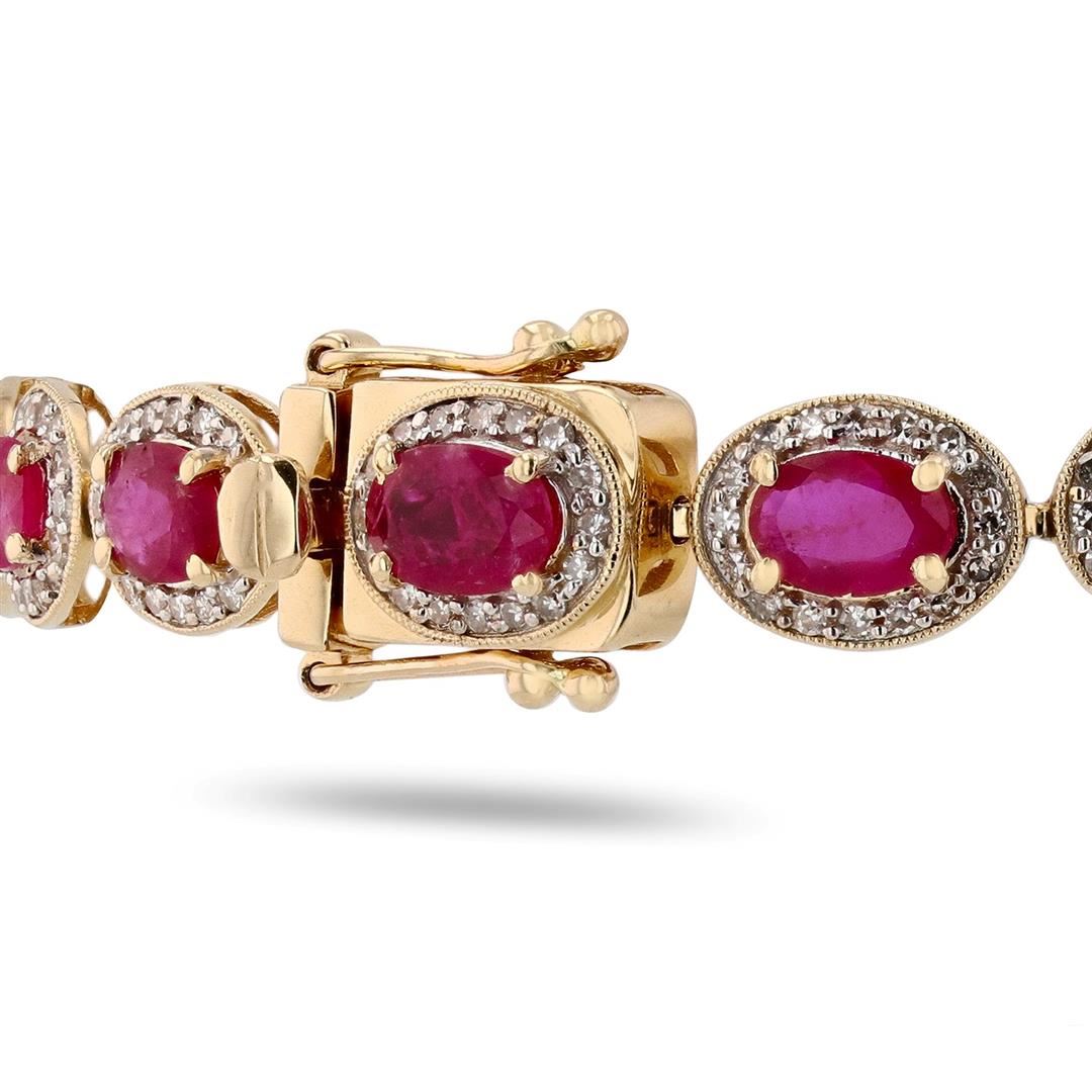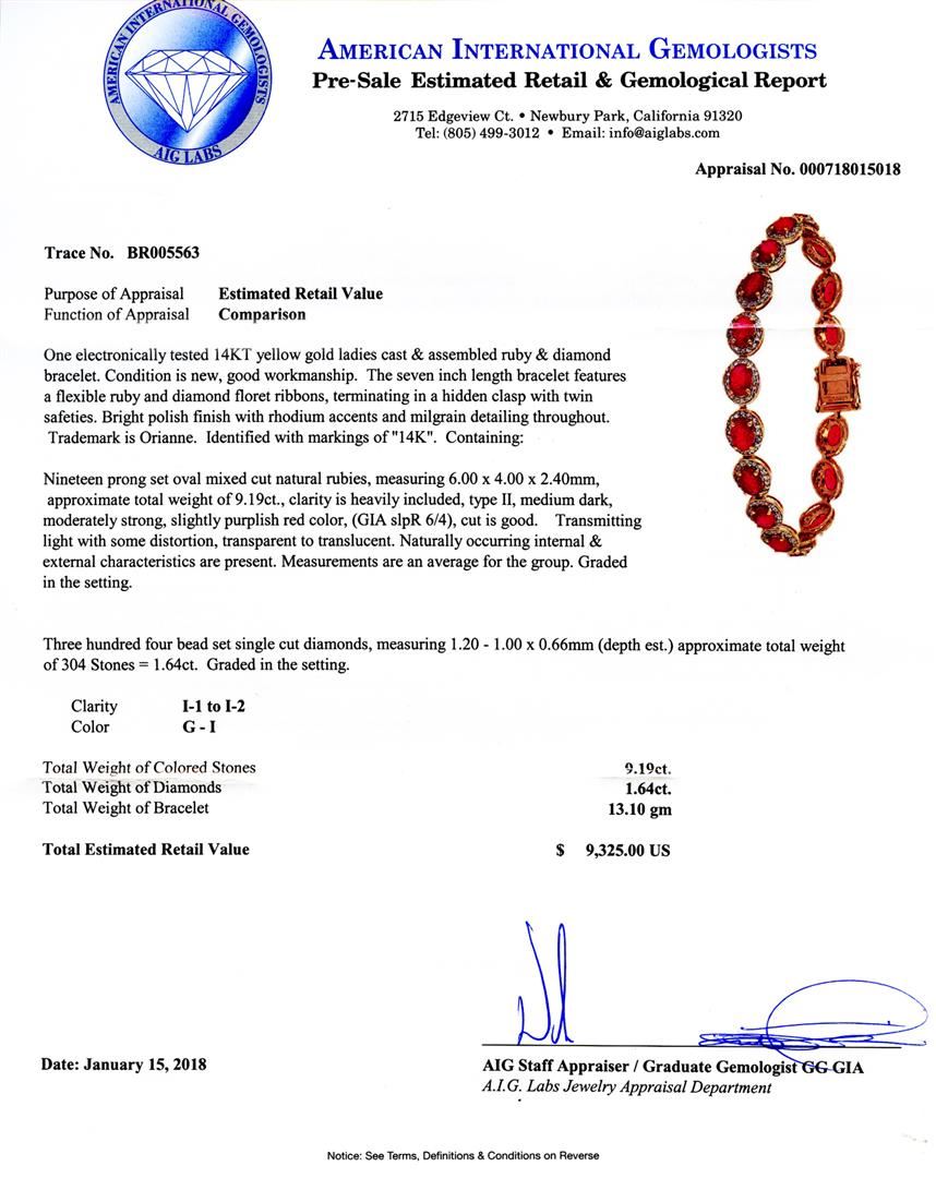 One electronically tested 14KT yellow gold ladies cast and assembled ruby and diamond bracelet. Condition is new, good workmanship. The seven inch length bracelet features a flexible ruby and diamond floret ribbons, terminating in a hidden clasp with twin safeties. Bright polish finish with rhodium accents and milgrain detailing throughout. Trademark is Orianne. Identified with markings of "14K". Containing: Nineteen prong set oval mixed cut natural rubies, measuring 6.00 x 4.00 x 2.40mm, approximate total weight of 9.19ct., clarity is heavily included, type II, medium dark, moderately strong, slightly purplish red color, (GIA slpR 6/4), cut is good. Transmitting light with some distortion, transparent to translucent. Naturally occurring internal and external characteristics are present. Measurements are an average for the group. Graded in the setting. Three hundred four bead set single cut diamonds, measuring 1.20 - 1.00 x 0.66mm (depth est.) approximate total weight of 304 Stones = 1.64ct. Graded in the setting. Clarity I-1 to I-2 Color G-I Total Weight of Colored Stones 9.19ct Total Weight of Diamonds 1.64ct. Total Weight of Bracelet 13.10 gm