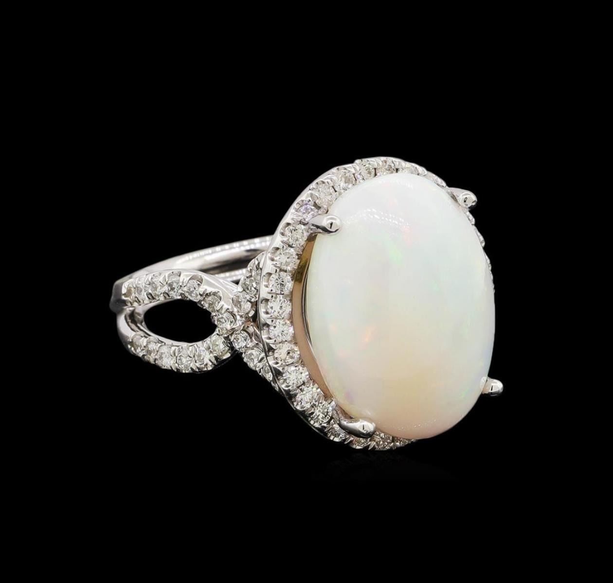 One electronically tested 14KT white gold lady's cast fashion ring with a split crossover shank with halo with a bright polish finish. The featured lady's ring has a double shank measuring 3.40 millimeters wide. Identified with markings of '14K'. Condition is new, good workmanship. Containing: One crystal opal that is cut in a oval shaped cabochon and is prong set, measuring 17.52 mm long x 13.20 mm wide, and 8.28 mm thick and the approximate weight is 9.20 carats. The opal has a somewhat bright, multicolor play of color (fire) in a rolling flashfire pattern; a medium dome; a good cut; no inclusions; minor dull spot in its brightness and pattern; and is not directional. Graded in the setting. Seventy-Four prong set round brilliant cut diamonds, measuring 1.60 - 1.50 x 0.96mm (depth est.) approximate total weight of 74 Stones = 1.05ct. Graded in the setting. Clarity SI-1 to I-1. Color: G - I Cut Good Forty prong set round brilliant cut diamonds, measuring 1.20 - 1.15 x 0.73mm (depth est.) approximate total weight of 40 Stones = 0.25ct. Graded in the setting. Clarity SI-1 to I-1. Color: G - I Cut Good. Total Weight of Diamonds 1.30ct.. Total Weight of Opals 9.20ct.. Total Weight of Ring 10.20gm. GAS Appraised.
