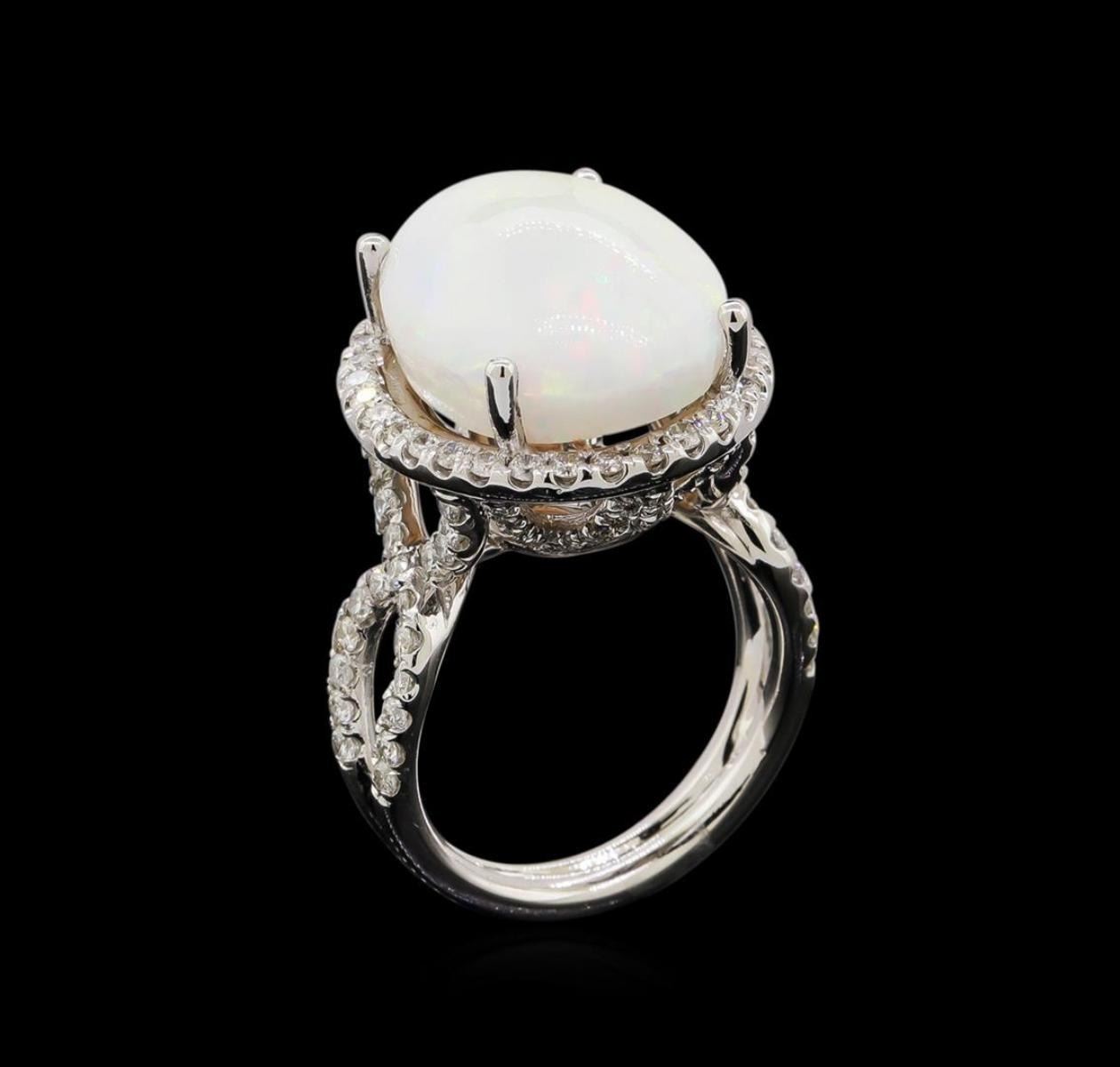 One electronically tested 14KT white gold lady's cast fashion ring with a split crossover shank with halo with a bright polish finish. The featured lady's ring has a double shank measuring 3.40 millimeters wide. Identified with markings of '14K'. Condition is new, good workmanship. Containing: One crystal opal that is cut in a oval shaped cabochon and is prong set, measuring 17.52 mm long x 13.20 mm wide, and 8.28 mm thick and the approximate weight is 9.20 carats. The opal has a somewhat bright, multicolor play of color (fire) in a rolling flashfire pattern; a medium dome; a good cut; no inclusions; minor dull spot in its brightness and pattern; and is not directional. Graded in the setting. Seventy-Four prong set round brilliant cut diamonds, measuring 1.60 - 1.50 x 0.96mm (depth est.) approximate total weight of 74 Stones = 1.05ct. Graded in the setting. Clarity SI-1 to I-1. Color: G - I Cut Good Forty prong set round brilliant cut diamonds, measuring 1.20 - 1.15 x 0.73mm (depth est.) approximate total weight of 40 Stones = 0.25ct. Graded in the setting. Clarity SI-1 to I-1. Color: G - I Cut Good. Total Weight of Diamonds 1.30ct.. Total Weight of Opals 9.20ct.. Total Weight of Ring 10.20gm. GAS Appraised.