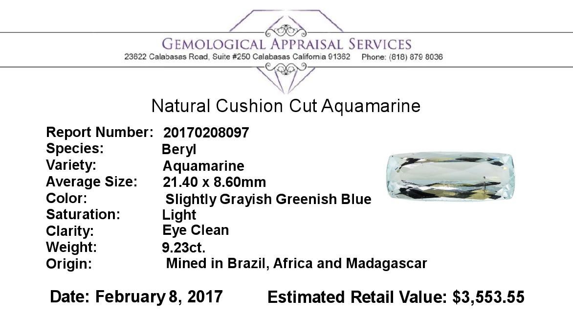 One natural cushion cut aquamarine with an exact weight of 9.23ct., clarity is eye clean, slightly grayish greenish blue, light. Gemological Appraisals Services estimates the retail value at $3553.55 GAS Appraised.