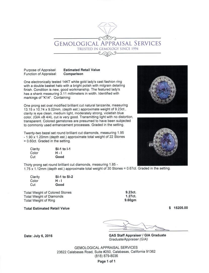 One electronically tested 14KT white gold lady's cast fashion ring with a double basket halo with a bright polish with milgrain detailing finish. The featured lady's has a shank measuring 3.11 millimeters in width. Identified with markings of "K14". Condition is new, good workmanship. Containing: One prong set oval modified brilliant cut natural tanzanite, measuring 13.15 x 10.74 x 9.02mm, (depth est.) approximate weight of 9.23ct., clarity is eye clean, medium light, moderately strong, violetish blue color, (GIA vB 4/4), cut is very good. Transmitting light with no distortion, transparent. Colored gemstones are presumed to have been subjected to commonly used enhancement processes. Graded in the setting. Twenty-Two bezel set round brilliant cut diamonds, measuring 1.95 - 1.90 x 1.20mm (depth est.) approximate total weight of 22 Stones = 0.60ct. Graded in the setting. Clarity: SI-1 to I-1. Color: H - I. Cut Good Thirty prong set round brilliant cut diamonds, measuring 1.85 - 1.75 x 1.12mm (depth est.) approximate total weight of 30 Stones = 0.67ct. Graded in the setting. Clarity: SI-1 to SI-2. Color: H - I. Cut Good. Total Weight of Colored Stones 9.23ct. Total Weight of Diamonds 1.27ct. Total Weight of Ring 9.60gm. GAS Appraised.
