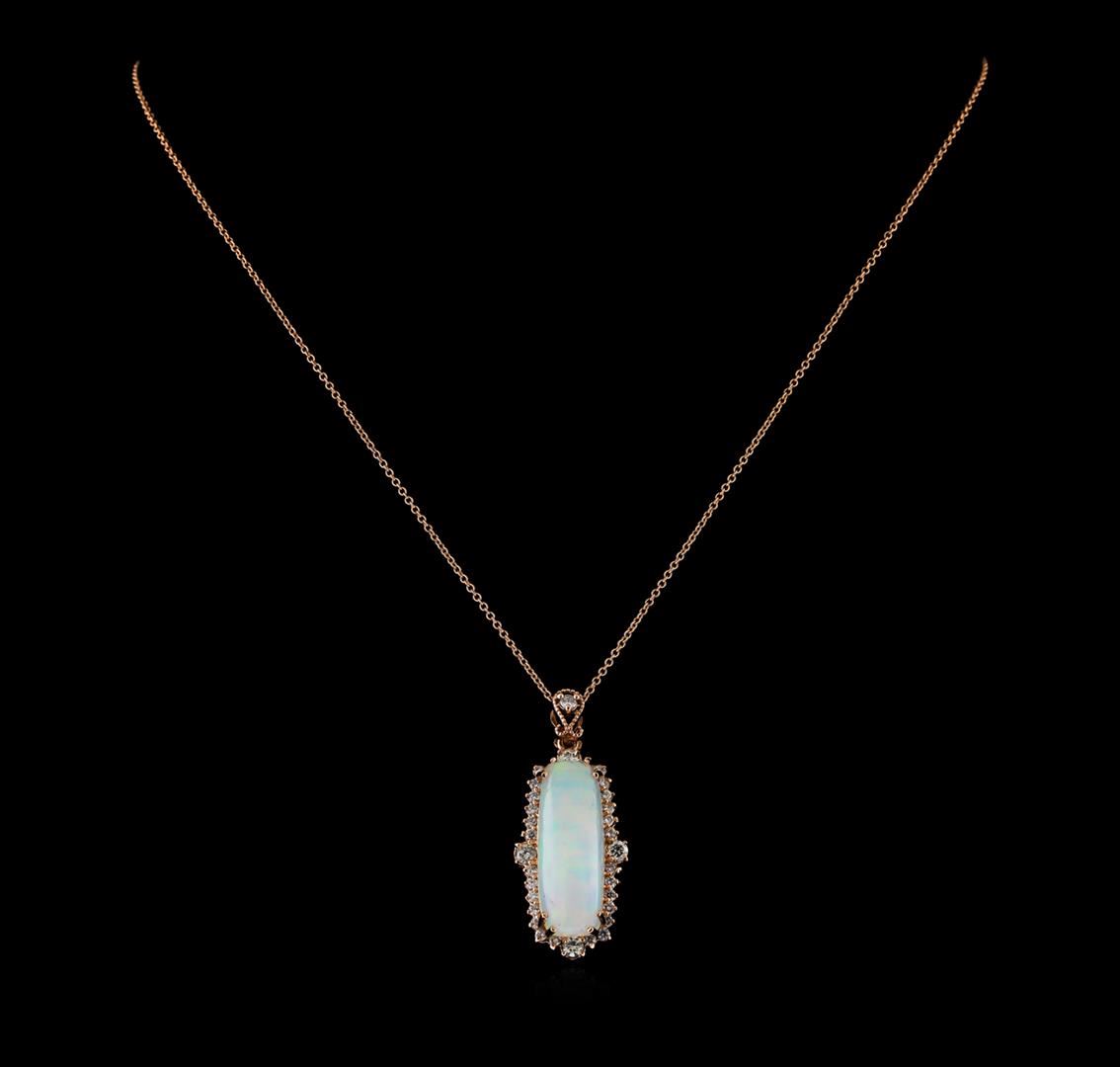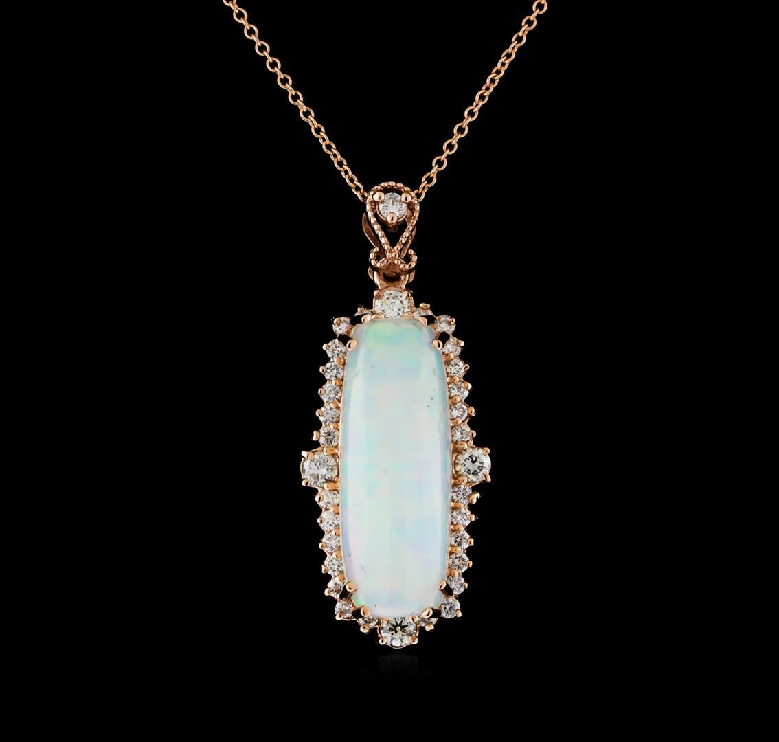 One electronically tested 14KT rose gold ladies cast & assembled opal and diamond pendant with chain. The pendant features an opal set within a stylized diamond bezel, completed by a diamond accented bail. The pendant is supported by an eighteen inch length 14KT rose gold designer style chain, terminating in a lobster claw clasp. Bright polish finish with milgrain detailing. Identified with markings of "K14". Condition is new, good workmanship. Containing: One semi crystal opal that is cut in a rectangular cus shaped cabochon and is prong set, measuring 25.50 mm long x 9.45 mm wide, and 6.10 mm thick and the approximate weight is 9.27 carats. The opal has a somewhat bright, multicolor play of color (fire) in a flashfire pattern; a medium dome; a good cut; no inclusions; minor dull spot in its brightness and pattern; and is slightly directional. Graded in the setting. Four prong set round brilliant cut diamonds, measuring 3.00 - 2.90 x 1.77mm (depth est.) approximate. Total Weight of 4 Stones = 0.42ct. Graded in the setting. Clarity: SI-2 to I-1. Color: G - H Twenty-Nine prong set round brilliant cut diamonds, measuring 1.70 - 1.60 x 0.99mm (depth est.) approximate. Total Weight of 29 Stones = 0.57ct. Graded in the setting. Clarity: SI-2 to I-1. Color: G - H. Total Weight of Diamonds 0.99ct. Total Weight of Opals 9.27ct. Total Weight of Pendant With Chain 9.89gm. AIG Appraised at $7,780.00.