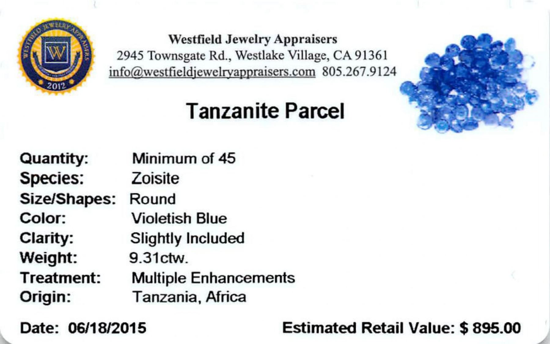 Forty-five round mixed cut natural tanzanites exact total weight 9.31ct., clarity is slightly included, type I, medium dark, slightly grayish, violetish blue color, (GIA vB 6/2), cut is good. Measurements & the color grade are an average for the group, Color grade is an average for the group, Naturally occurring internal & external characteristics are present, Indications of laboratory high temperature heat treatment. Westfield Appraised at $895.00.