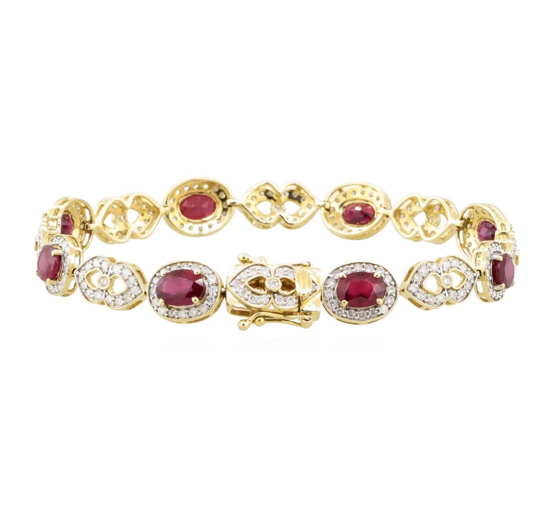 One electronically tested 14KT yellow gold ladies cast & assembled ruby & diamond bracelet. The seven and one quarter inch length bracelet features a series of ruby & diamond bezels, alternating with a smaller series of diamond heart duo links, completed by a concealed clasp, with twin safeties. Each ruby & diamond bezel is framed with milgrain detailing. Bright polish finish with rhodium accents. Identified with markings of "14K". Trademark is Orianne Condition is new, good workmanship. Containing: Eight prong set oval mixed cut natural rubies, measuring 7.00 x 5.00 x 3.25mm, approximate total weight of 9.32ct., clarity is heavily included, type II, dark, very slightly brownish, slightly purplish red color, (GIA slpR 7/3), cut is good. Transmitting light somewhat diffusely, transparent to translucent. Naturally occurring internal & external characteristics are present. Indications of laboratory high temperature heat treatment, with glass & flux additives. Graded in the setting. Ruby has a low tolerance to rhodium plating, repolishing the surface, & ultrasonic cleaning. Two Hundred Forty-Eight prong & bezel set round brilliant cut diamonds approximate total weight of 248 Stones = 2.33ct. Graded in the setting. Clarity SI-2 to I-2 Color G - H Total Weight of Colored Stones 9.32 ct. Total Weight of Diamonds 2.33 ct. Total Weight of Bracelet 14.20 gm Estimated Retail Value $ 10,400.00 US