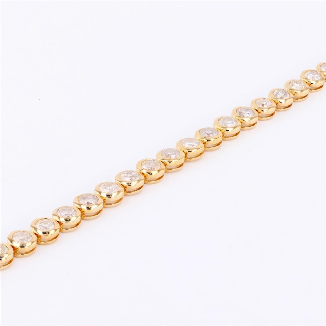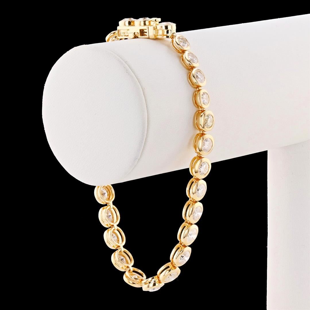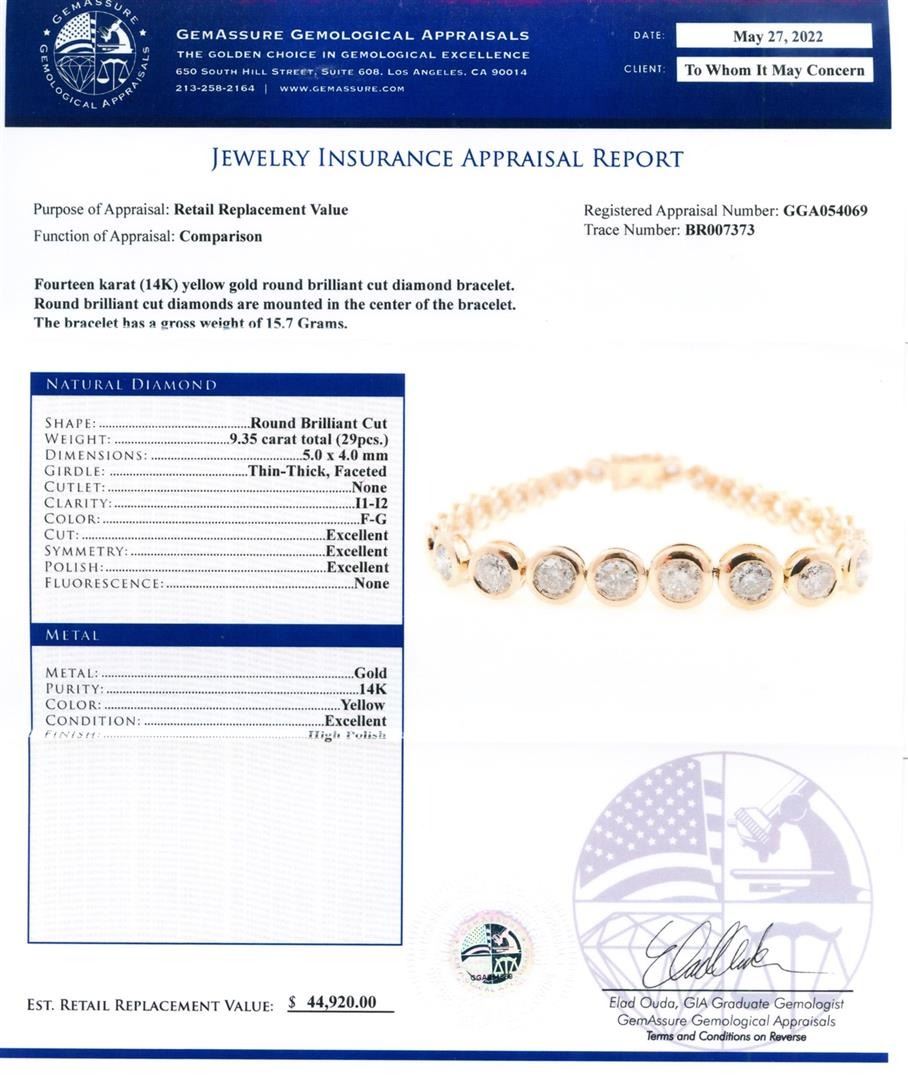 Fourteen karat (14K) yellow gold round brilliant cut diamond bracelet. Round brilliant cut diamonds are mounted in the center of the bracelet. The bracelet has a gross weight of 15.7 Grams. NATURAL DIAMOND SHAPE: Round Brilliant Cut WEIGHT: 9.35 carat