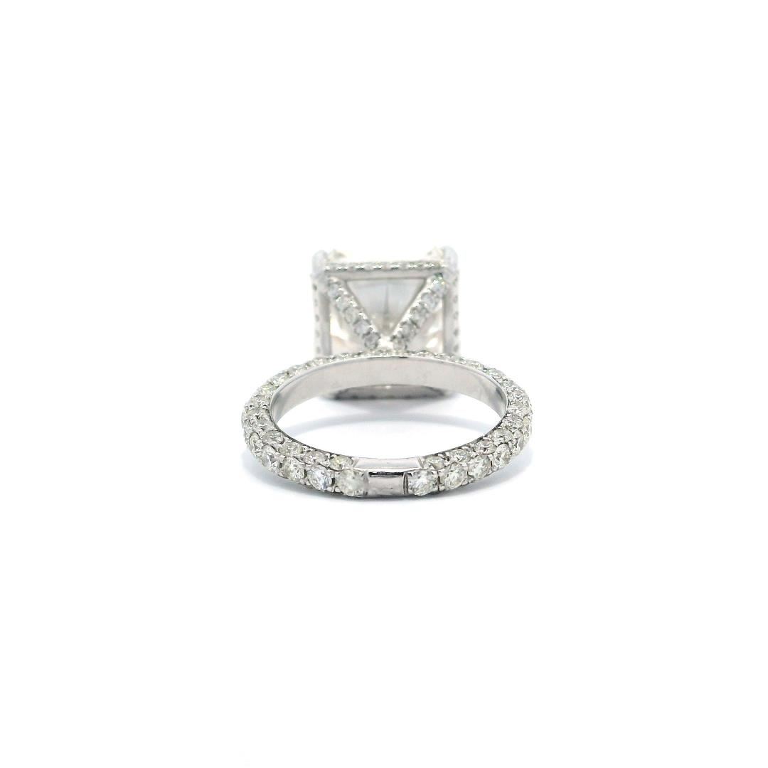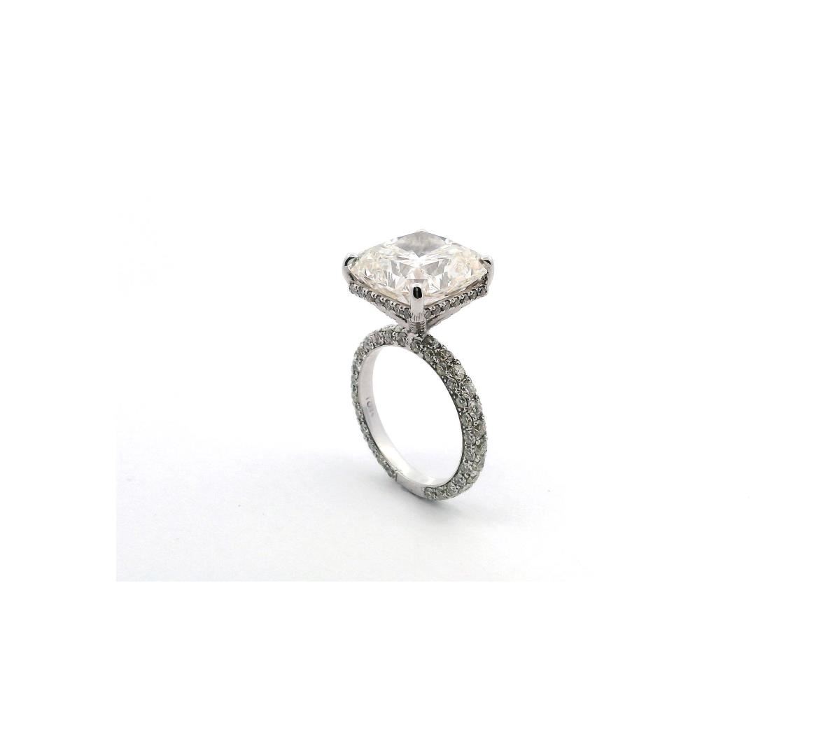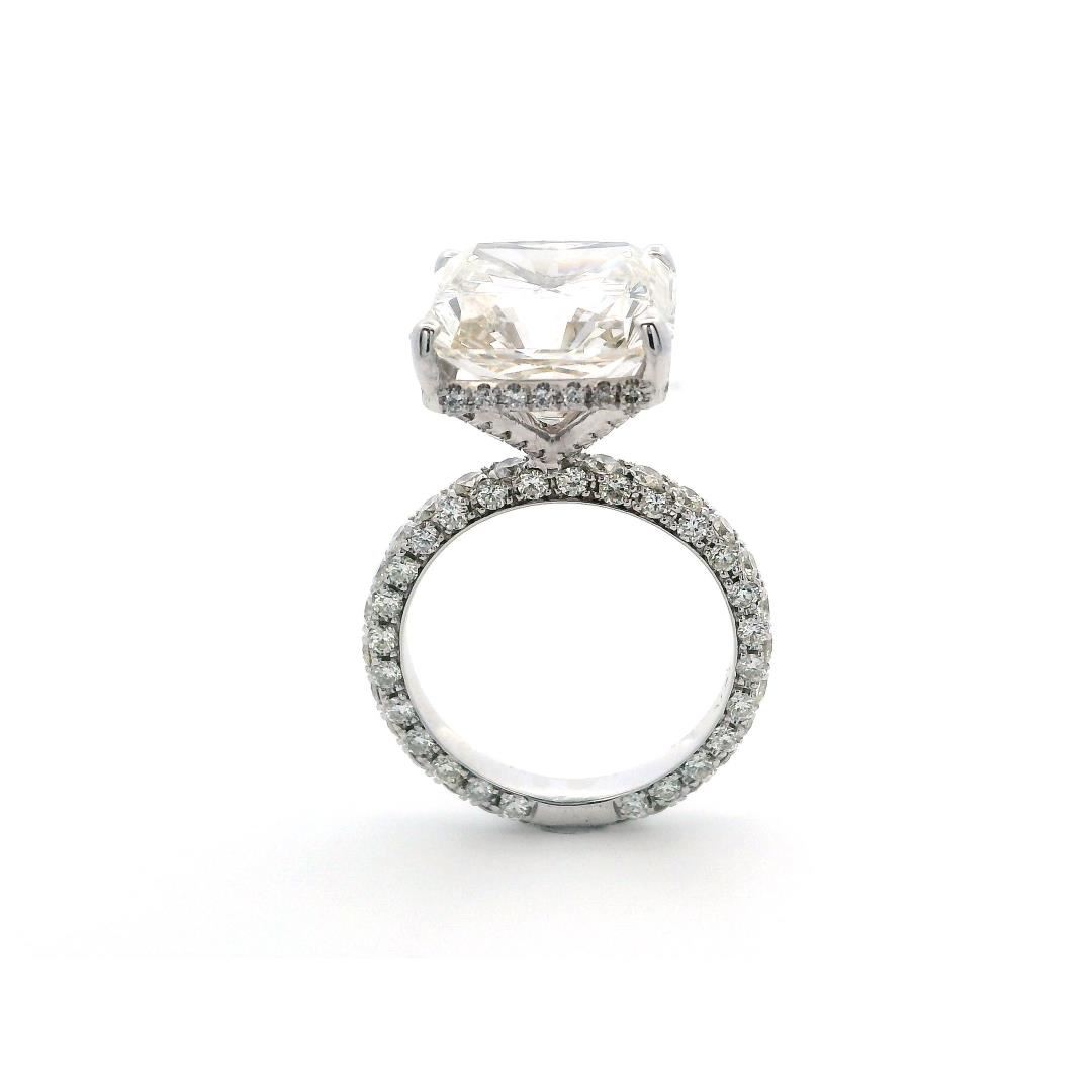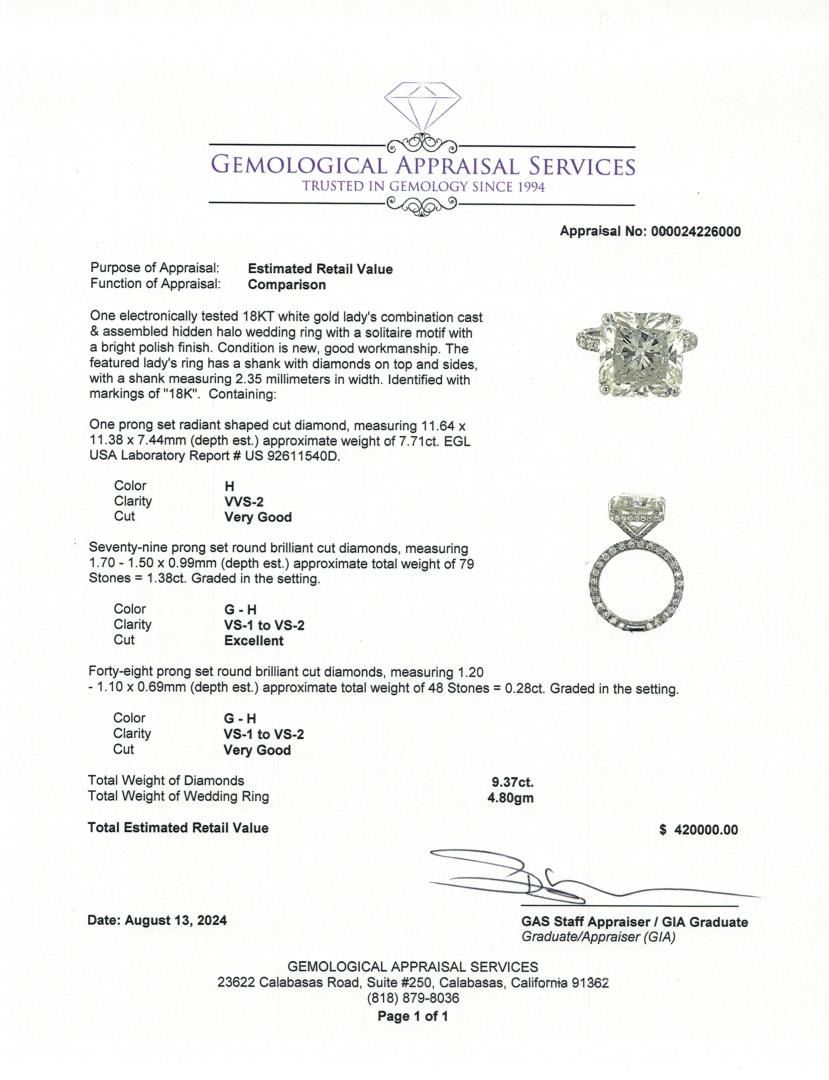This ring features an incredible 7.71ct radiant cut diamond with VVS-2 clarity and H color. Excellent craftsmanship and EGL certified! One electronically tested 18KT white gold lady's combination cast & assembled hidden halo wedding ring with a solitaire motif with a bright polish finish. Condition is new, good workmanship. The featured lady's ring has a shank with diamonds on top and sides, with a shank measuring 2.35 millimeters in width. Identified with markings of 18K. Containing: One prong set radiant shaped cut diamond, measuring 11.64 x 11.38 x 7.44mm (depth est.) approximate weight of 7.71ct. EGL USA Laboratory Report # US 92611540D. Color: H Clarity: VVS-2 Cut: Very Good Seventy-nine prong set round brilliant cut diamonds, measuring 1.70 - 1.50 x 0.99mm (depth est.) approximate total weight of 79 Stones = 1.38ct. Graded in the setting. Color: G-H Clarity: VS-1 to VS-2 Cut: Excellent Forty-eight prong set round brilliant cut diamonds, measuring 1.20 - 1.10 x 0.69mm (depth est.) approximate total weight of 48 Stones = 0.28ct. Graded in the setting. Color: G-H Clarity: VS-1 to VS-2 Cut: Very Good Total Weight of Diamonds: 9.37ct. Total Weight of Wedding Ring: 4.80gm Total Estimated Retail Value: $420,000.00 Appraisal No: 000024226000