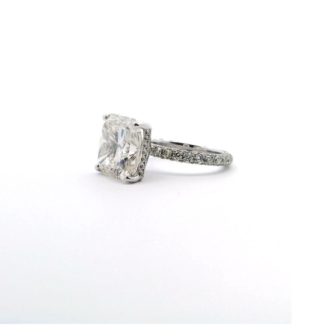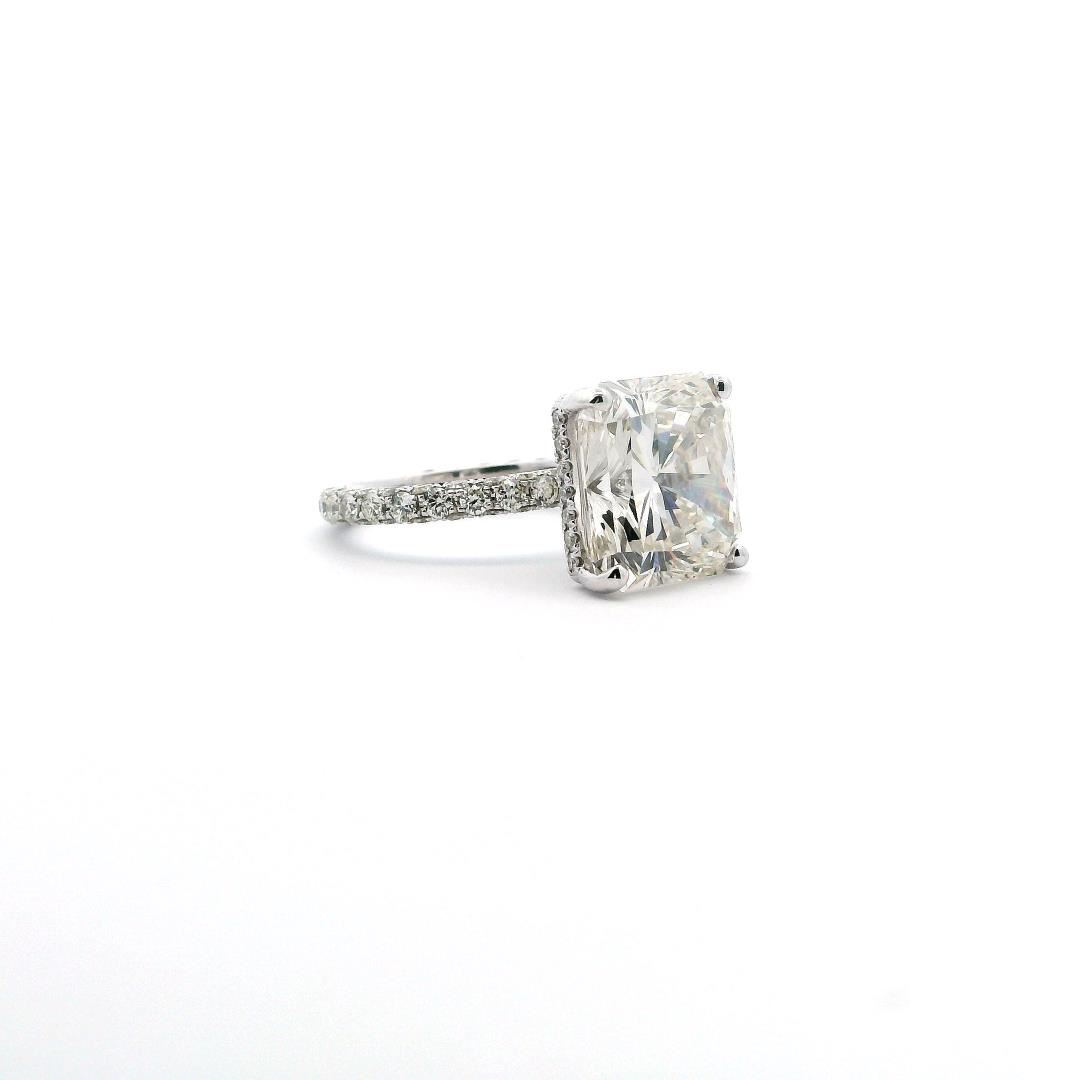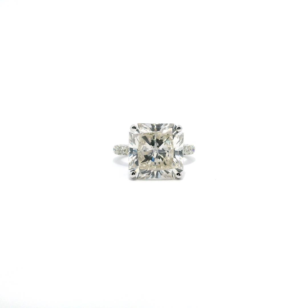 This ring features an incredible 7.71ct radiant cut diamond with VVS-2 clarity and H color. Excellent craftsmanship and EGL certified! One electronically tested 18KT white gold lady's combination cast & assembled hidden halo wedding ring with a solitaire motif with a bright polish finish. Condition is new, good workmanship. The featured lady's ring has a shank with diamonds on top and sides, with a shank measuring 2.35 millimeters in width. Identified with markings of 18K. Containing: One prong set radiant shaped cut diamond, measuring 11.64 x 11.38 x 7.44mm (depth est.) approximate weight of 7.71ct. EGL USA Laboratory Report # US 92611540D. Color: H Clarity: VVS-2 Cut: Very Good Seventy-nine prong set round brilliant cut diamonds, measuring 1.70 - 1.50 x 0.99mm (depth est.) approximate total weight of 79 Stones = 1.38ct. Graded in the setting. Color: G-H Clarity: VS-1 to VS-2 Cut: Excellent Forty-eight prong set round brilliant cut diamonds, measuring 1.20 - 1.10 x 0.69mm (depth est.) approximate total weight of 48 Stones = 0.28ct. Graded in the setting. Color: G-H Clarity: VS-1 to VS-2 Cut: Very Good Total Weight of Diamonds: 9.37ct. Total Weight of Wedding Ring: 4.80gm Total Estimated Retail Value: $420,000.00 Appraisal No: 000024226000