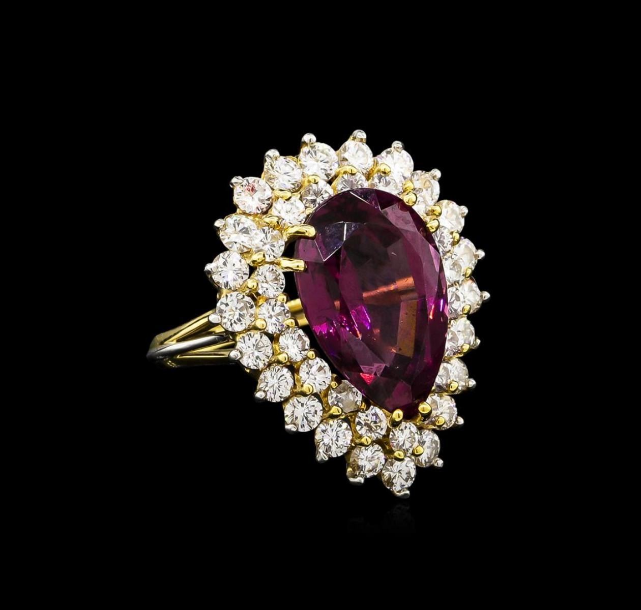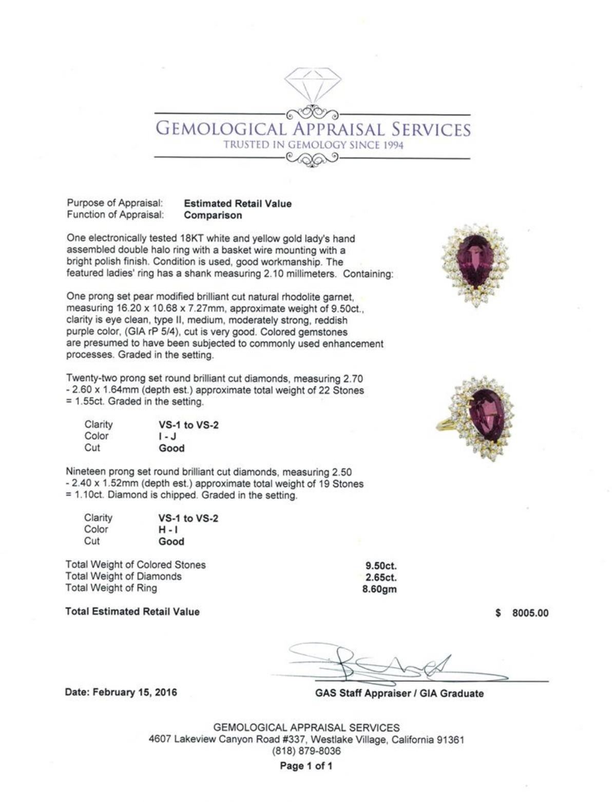 One electronically tested 18KT white and yellow gold lady's hand assembled double halo ring with a basket wire mounting with a bright polish finish. The featured ladies' ring has a shank measuring 2.10 millimeters. Condition is used, good workmanship. Containing: One prong set pear modified brilliant cut natural rhodolite garnet, measuring 16.20 x 10.68 x 7.27mm, approximate weight of 9.50ct., clarity is eye clean, type II, medium, moderately strong, reddish purple color, (GIA rP 5/4), cut is very good. Colored gemstones are presumed to have been subjected to commonly used enhancement processes. Graded in the setting. Twenty-Two prong set round brilliant cut diamonds, measuring 2.70 - 2.60 x 1.64mm (depth est.) approximate total weight of 22 Stones = 1.55ct. Graded in the setting. Clarity: VS-1 to VS-2. Color: I - J. Cut Good Nineteen prong set round brilliant cut diamonds, measuring 2.50 - 2.40 x 1.52mm (depth est.) approximate total weight of 19 Stones = 1.10ct. Diamond is chipped. Graded in the setting. Clarity: VS-1 to VS-2. Color: H - I. Cut Good. Total Weight of Colored Stones 9.50ct. Total Weight of Diamonds 2.65ct. Total Weight of Ring 8.60gm. GAS Appraised at $8,005.00.