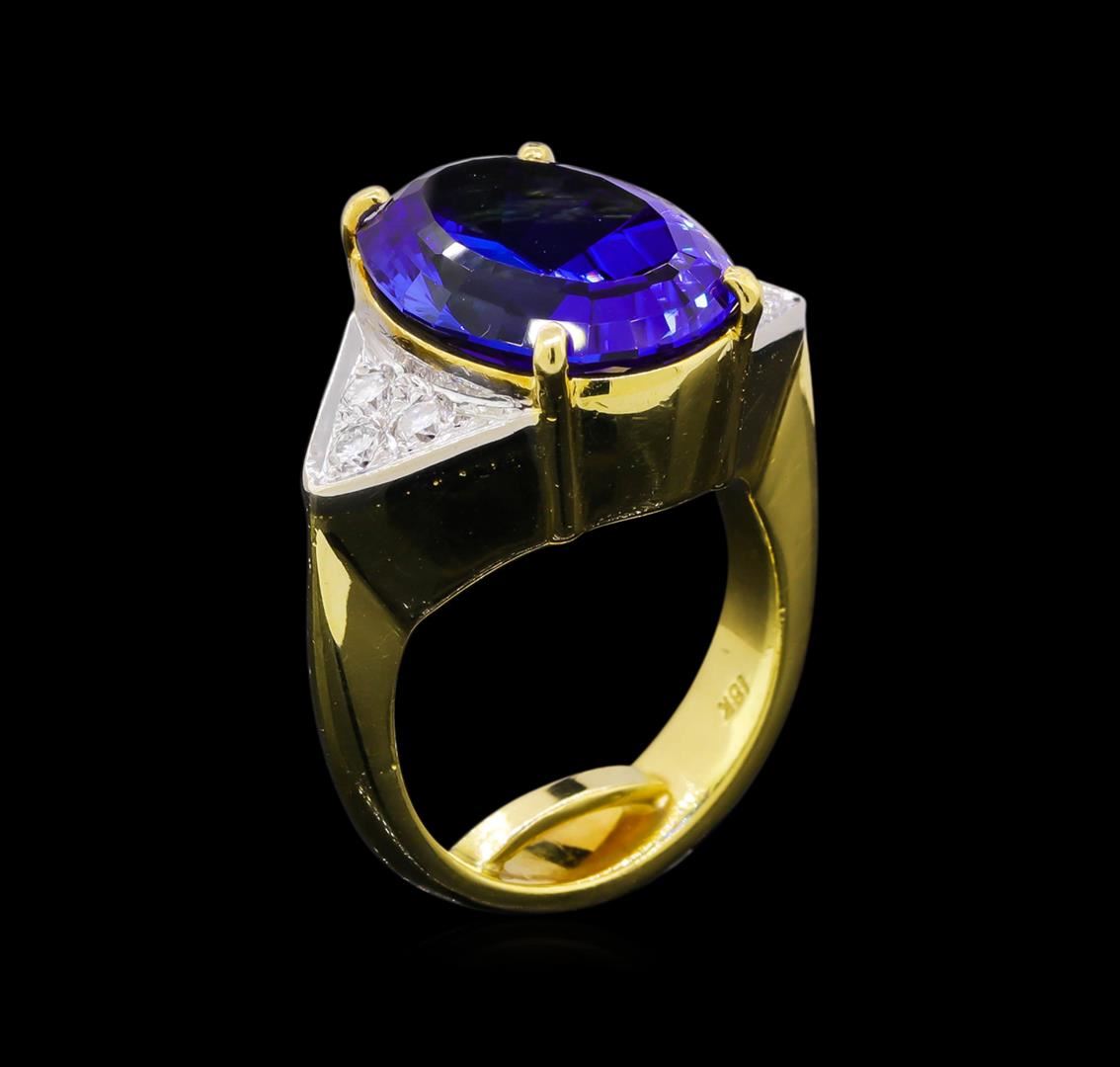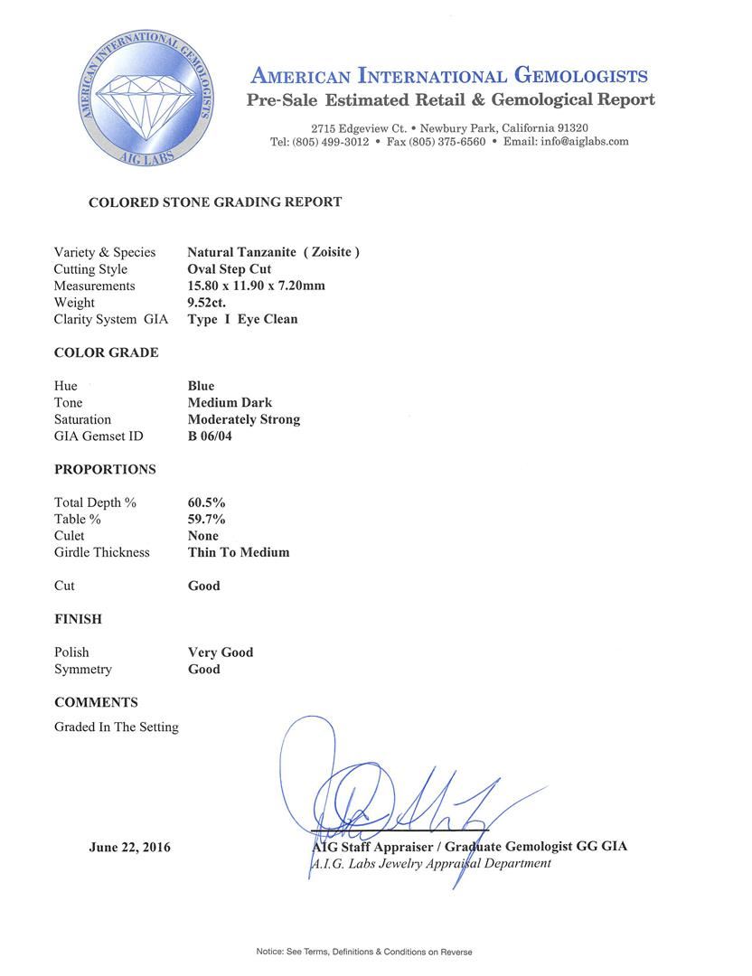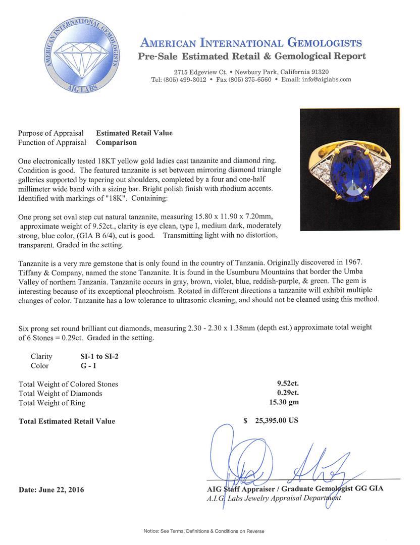 One electronically tested 18KT yellow gold ladies cast tanzanite and diamond ring. The featured tanzanite is set between mirroring diamond triangle galleries supported by tapering out shoulders, completed by a four and one-half millimeter wide band with a sizing bar. Bright polish finish with rhodium accents. Identified with markings of "18K". Condition is good. Containing: One prong set oval step cut natural tanzanite, measuring 15.80 x 11.90 x 7.20mm, approximate weight of 9.52ct., clarity is eye clean, type I, medium dark, moderately strong, blue color, (GIA B 6/4), cut is good. Transmitting light with no distortion, transparent. Graded in the setting. Tanzanite is a very rare gemstone that is only found in the country of Tanzania. Originally discovered in 1967. Tiffany & Company, named the stone Tanzanite. It is found in the Usumburu Mountains that border the Umba Valley of northern Tanzania. Tanzanite occurs in gray, brown, violet, blue, reddish-purple, & green. The gem is interesting because of its exceptional pleochroism. Rotated in different directions a tanzanite will exhibit multiple changes of color. Tanzanite has a low tolerance to ultrasonic cleaning, and should not be cleaned using this method. Six prong set round brilliant cut diamonds, measuring 2.30 - 2.30 x 1.38mm (depth est.) approximate total weight of 6 Stones = 0.29ct. Graded in the setting. Clarity: SI-1 to SI-2 . Color: G - I. Total Weight of Colored Stones 9.52ct.. Total Weight of Diamonds 0.29ct.. Total Weight of Ring 15.30gm. AIG Appraised.