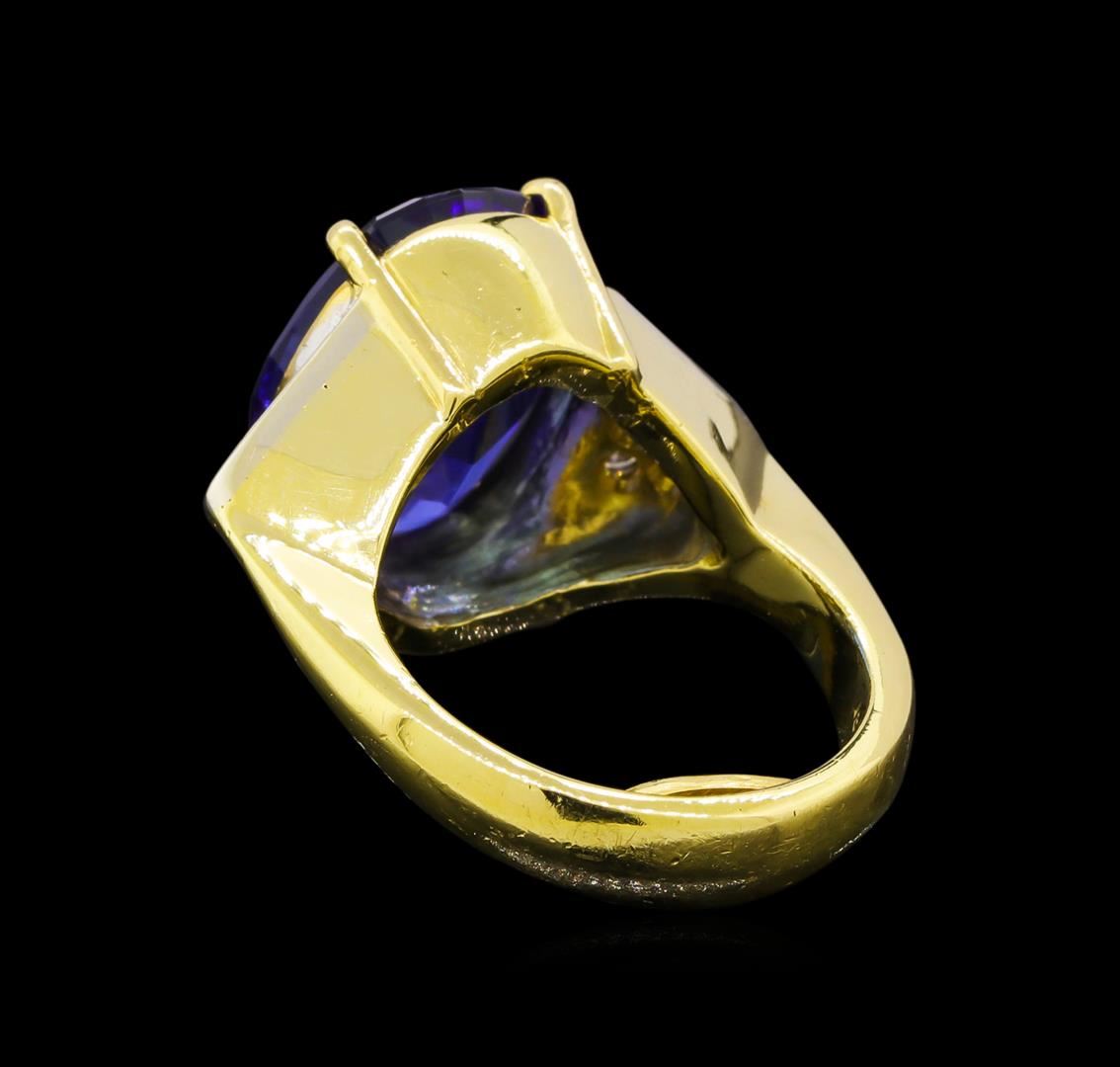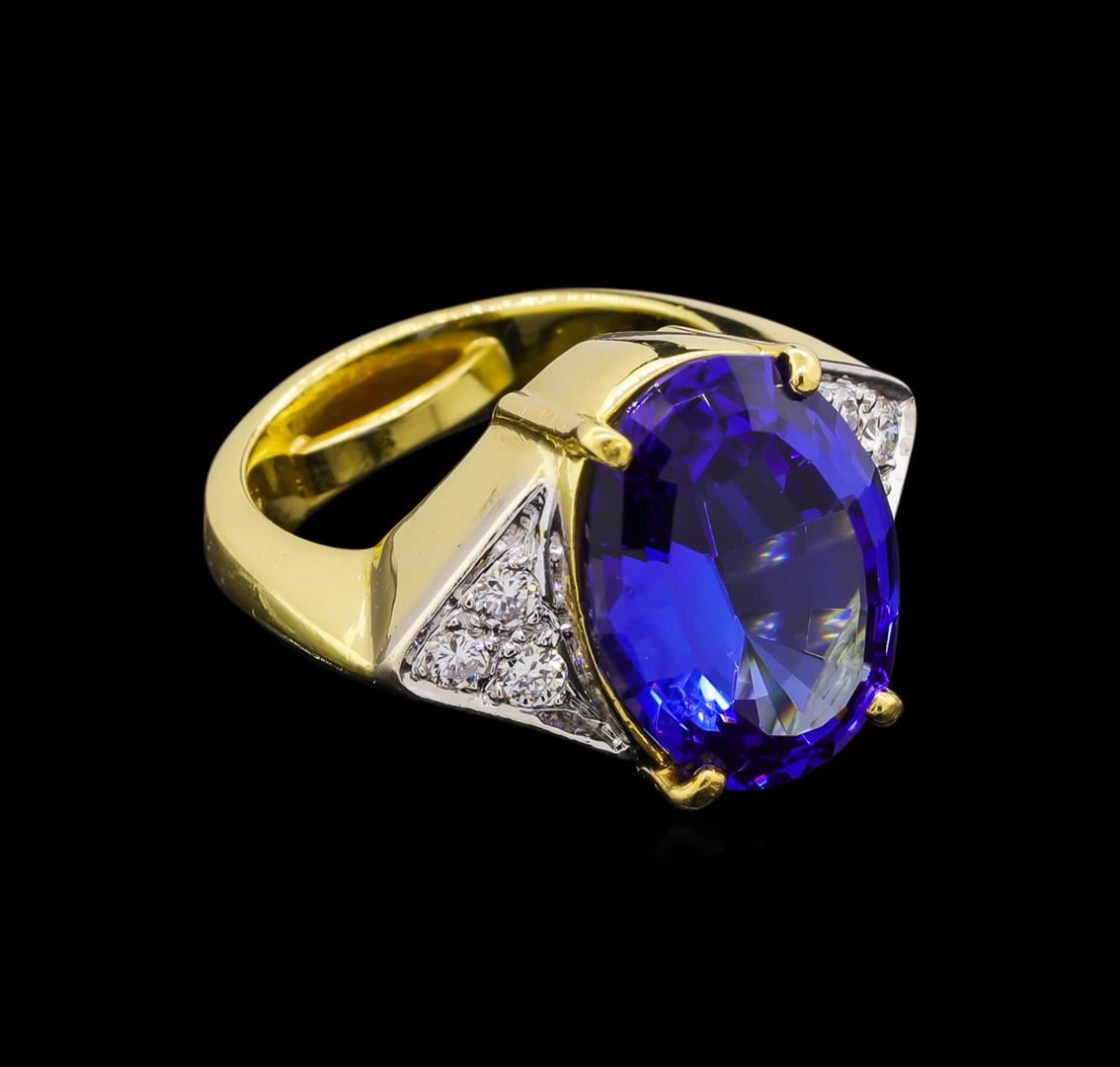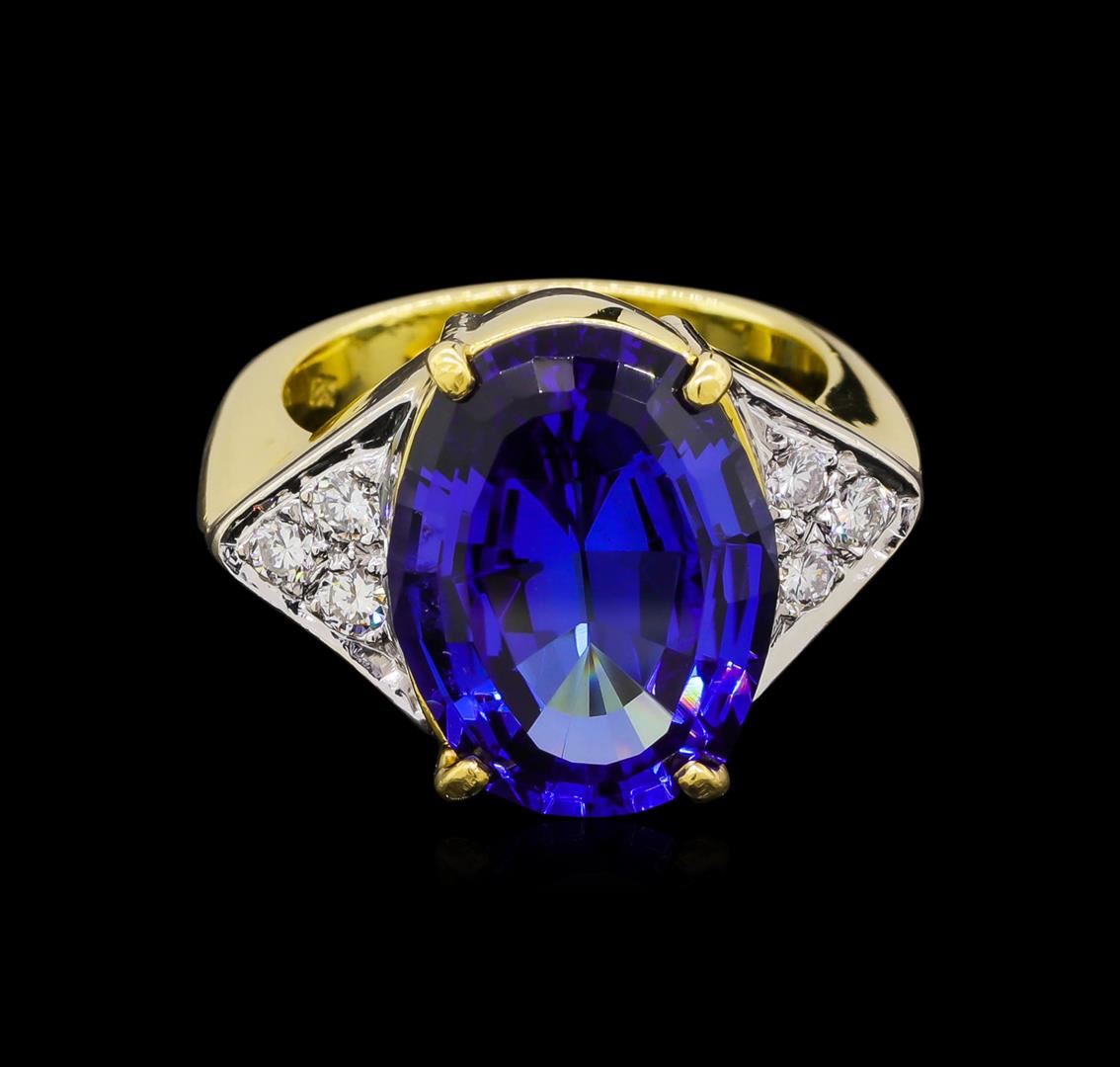 One electronically tested 18KT yellow gold ladies cast tanzanite and diamond ring. The featured tanzanite is set between mirroring diamond triangle galleries supported by tapering out shoulders, completed by a four and one-half millimeter wide band with a sizing bar. Bright polish finish with rhodium accents. Identified with markings of "18K". Condition is good. Containing: One prong set oval step cut natural tanzanite, measuring 15.80 x 11.90 x 7.20mm, approximate weight of 9.52ct., clarity is eye clean, type I, medium dark, moderately strong, blue color, (GIA B 6/4), cut is good. Transmitting light with no distortion, transparent. Graded in the setting. Tanzanite is a very rare gemstone that is only found in the country of Tanzania. Originally discovered in 1967. Tiffany & Company, named the stone Tanzanite. It is found in the Usumburu Mountains that border the Umba Valley of northern Tanzania. Tanzanite occurs in gray, brown, violet, blue, reddish-purple, & green. The gem is interesting because of its exceptional pleochroism. Rotated in different directions a tanzanite will exhibit multiple changes of color. Tanzanite has a low tolerance to ultrasonic cleaning, and should not be cleaned using this method. Six prong set round brilliant cut diamonds, measuring 2.30 - 2.30 x 1.38mm (depth est.) approximate total weight of 6 Stones = 0.29ct. Graded in the setting. Clarity: SI-1 to SI-2 . Color: G - I. Total Weight of Colored Stones 9.52ct.. Total Weight of Diamonds 0.29ct.. Total Weight of Ring 15.30gm. AIG Appraised.