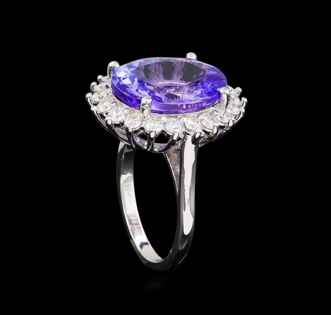 One electronically tested 14KT white gold ladies cast tanzanite and diamond ring with a bright polish finish. The featured tanzanite is set within a diamond bezel supported by a ribbed under gallery, completed by a two millimeter wide band. Identified with markings of "14K". Condition is new, good workmanship. Containing: One prong set oval mixed cut natural tanzanite, measuring 15.10 x 12.50 x 7.10mm, approximate weight of 9.62ct., clarity is eye clean, type I, medium dark, very slightly grayish, violet color, (GIA V 6/3), cut is good. Transmitting light with no distortion, transparent. Colored Stone Grading Report attached. Graded in the setting. Tanzanite is a very rare gemstone that is only found in the country of Tanzania. Originally discovered in 1967. Tiffany & Company, named the stone Tanzanite. It is found in the Usumburu Mountains that border the Umba Valley of northern Tanzania. Tanzanite occurs in gray, brown, violet, blue, reddish-purple, & green. The gem is interesting because of its exceptional pleochroism. Rotated in different directions a tanzanite will exhibit multiple changes of color. Tanzanite has a low tolerance to ultrasonic cleaning, and should not be cleaned using this method. Twenty prong set round brilliant cut diamonds approximate total weight of 20 Stones = 0.95ct. Clarity grade is an average for the group. Graded in the setting. Clarity: VS-2 to SI-2. Color: D - E. Total Weight of Colored Stones 9.62ct. Total Weight of Diamonds 0.95ct. Total Weight of Ring 7.84gm. AIG Appraised.