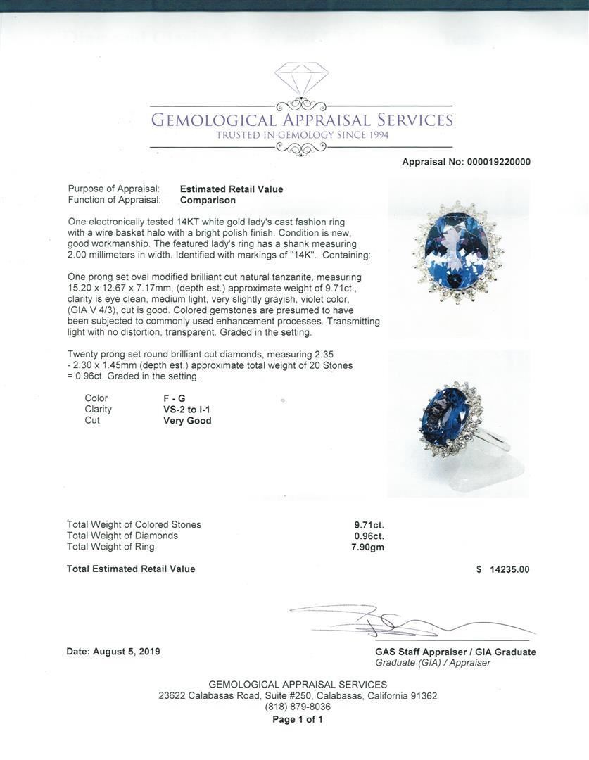 One electronically tested 14KT white gold ladies cast tanzanite and diamond ring with a bright polish finish. The featured tanzanite is set within a diamond bezel supported by a ribbed under gallery, completed by a two millimeter wide band. Identified with markings of "14K". Condition is new, good workmanship. Containing: One prong set oval mixed cut natural tanzanite, measuring 15.10 x 12.50 x 7.10mm, approximate weight of 9.62ct., clarity is eye clean, type I, medium dark, very slightly grayish, violet color, (GIA V 6/3), cut is good. Transmitting light with no distortion, transparent. Colored Stone Grading Report attached. Graded in the setting. Tanzanite is a very rare gemstone that is only found in the country of Tanzania. Originally discovered in 1967. Tiffany & Company, named the stone Tanzanite. It is found in the Usumburu Mountains that border the Umba Valley of northern Tanzania. Tanzanite occurs in gray, brown, violet, blue, reddish-purple, & green. The gem is interesting because of its exceptional pleochroism. Rotated in different directions a tanzanite will exhibit multiple changes of color. Tanzanite has a low tolerance to ultrasonic cleaning, and should not be cleaned using this method. Twenty prong set round brilliant cut diamonds approximate total weight of 20 Stones = 0.95ct. Clarity grade is an average for the group. Graded in the setting. Clarity: VS-2 to SI-2. Color: D - E. Total Weight of Colored Stones 9.62ct. Total Weight of Diamonds 0.95ct. Total Weight of Ring 7.84gm. AIG Appraised.