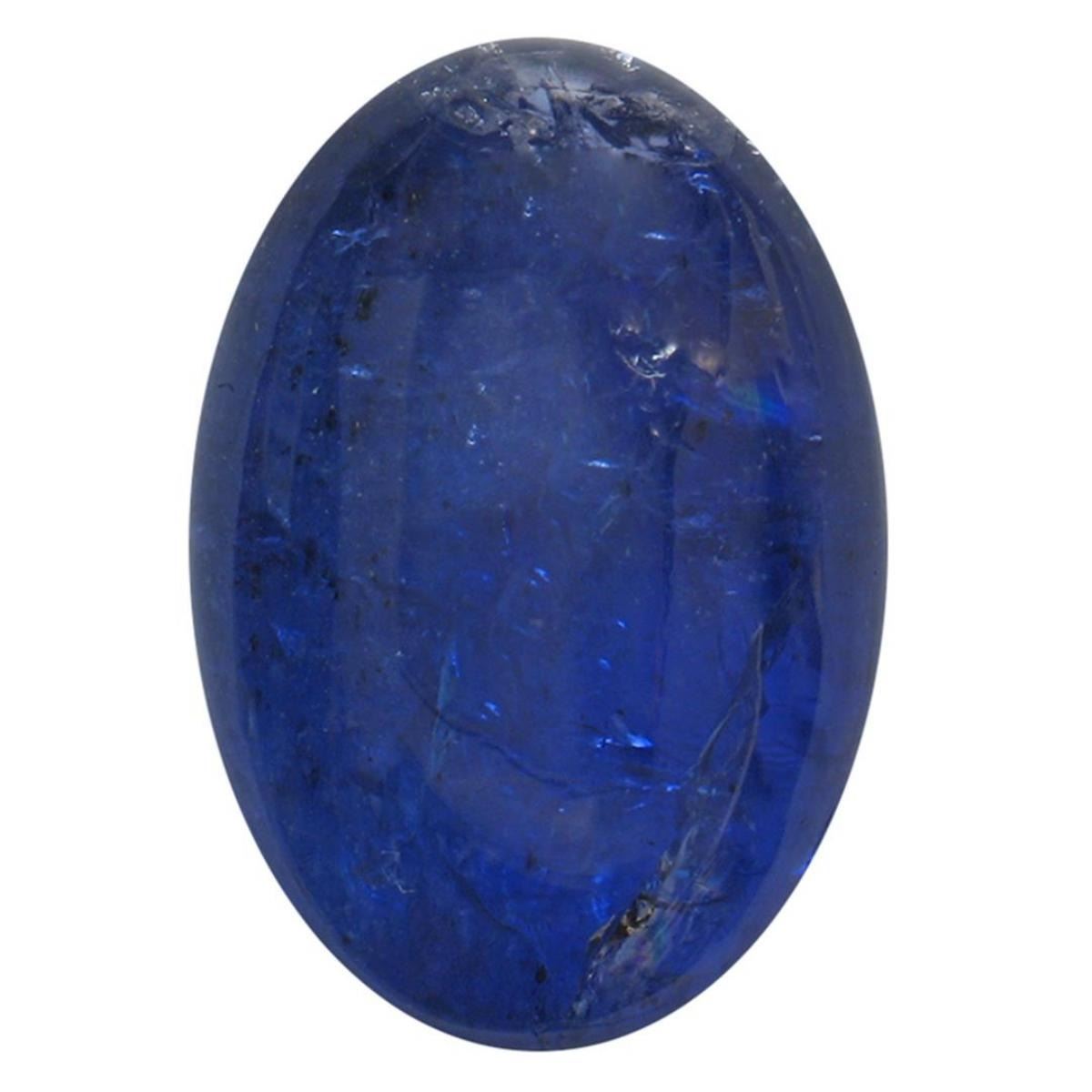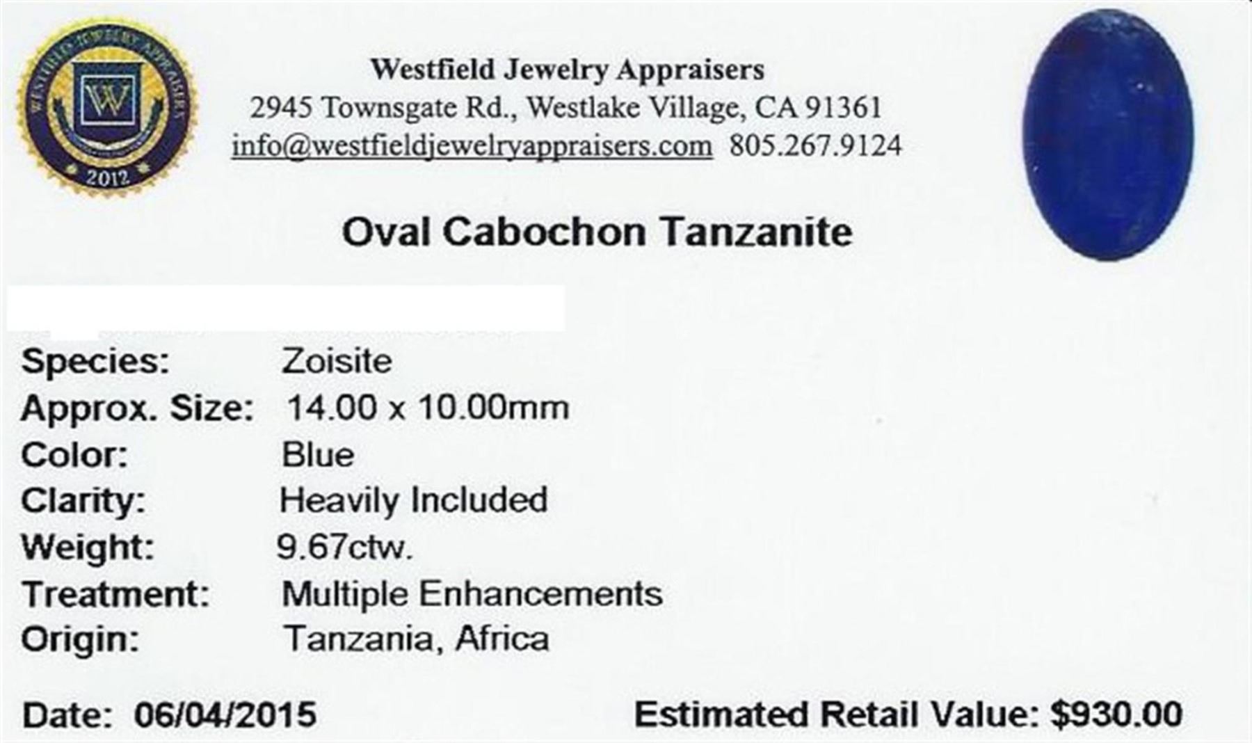 One oval cabochon cut natural tanzanite, measuring 15.00 x 11.00 x 6.00mm, exact weight 9.67ct., clarity is heavily included, type I, dark, moderately strong, blue color, (GIA B 7/4), cut is good. Transmitting light somewhat diffusely, transparent to translucent. Naturally occurring internal & external characteristics are present. Indications of heat treatment. Westfield Appraised.