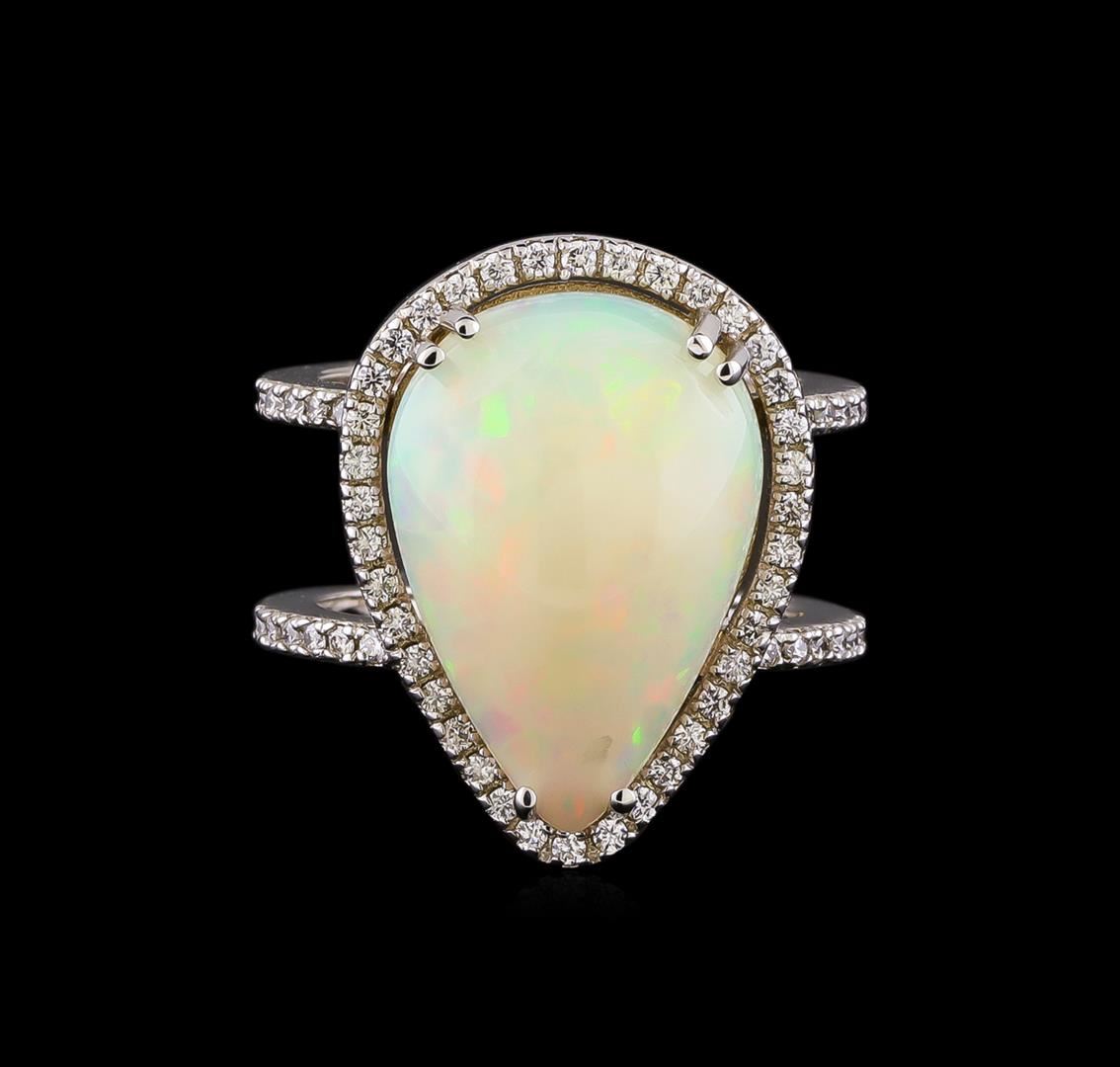 One electronically tested 14KT white gold ladies cast opal and diamond ring with a bright polish finish. The featured Welo Ethiopian opal is set within a diamond bezel supported by diamond set double shoulders each measuring one millimeter wide. The shoulders are connected to create a nine millimeter wide open band. Condition is new, good workmanship. Containing: One semi crystal opal that is cut in a pear shaped cabochon and is prong set, measuring 19.00 mm long x 13.20 mm wide, and 6.20 mm thick and the approximate weight is 9.70 carats. The opal has a somewhat bright, multicolor play of color (fire) in a flashfire pattern; a medium dome; a good cut; no inclusions; slight variation in base in its brightness and pattern; and is slightly directional. Graded in the setting. Sixty prong set round brilliant cut diamonds, measuring 1.30 - 1.20 x 0.75mm (depth est.) approximate total weight of 60 Stones = 0.52ct. Graded in the setting. Clarity: SI-1 to I-1. Color: F - H. Total Weight of Diamonds 0.52ct. Total Weight of Opals 9.70ct. Total Weight of Ring 7.94gm. AIG Appraised at $5,735.00.