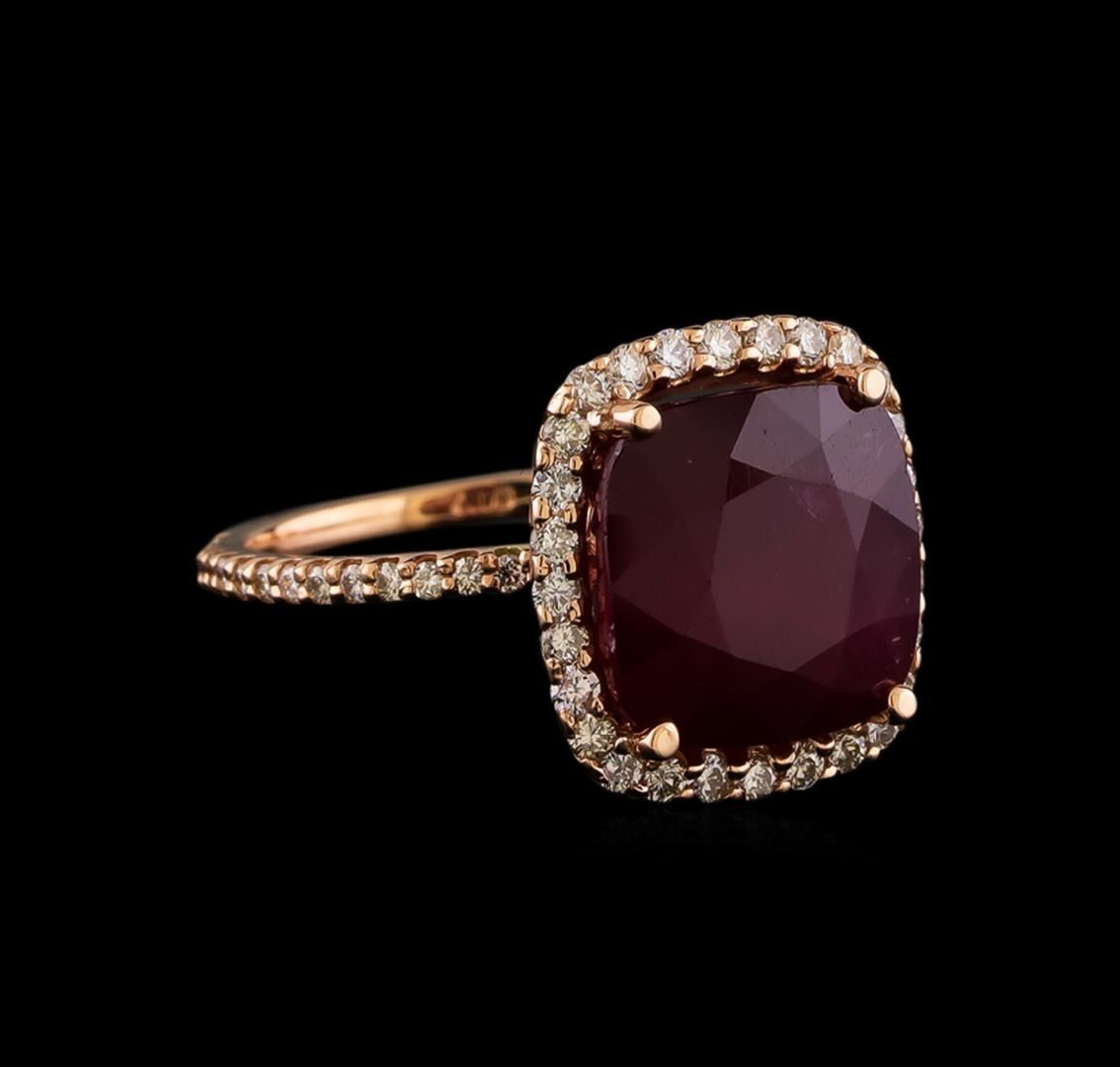 One electronically tested 14KT rose gold ladies cast ruby and diamond ring with a bright polish finish. The featured ruby is set within a diamond bezel supported by a diamond under gallery and diamond ribbon shoulders, completed by a one millimeter wide band. Identified with markings of '14K'. Condition is good. Containing: One prong set square cushion mixed cut natural ruby, measuring 11.10 x 11.10 x 7.70mm, 10%. bulge factor, approximate weight of 9.70ct., clarity is heavily included, type II, dark, very slightly brownish, slightly purplish red color, (GIA slpR 7/3), cut is good. Transmitting light somewhat diffusely, transparent to translucent. Naturally occurring internal & external characteristics are present. Indications of laboratory high temperature heat treatment, with glass & flux additives. Graded in the setting. Ruby has a low tolerance to rhodium plating, repolishing the surface, & ultrasonic cleaning. Twenty-Eight prong set round brilliant cut diamonds, measuring 1.60 - 1.50 x 0.93mm (depth est.) approximate total weight of 28 Stones = 0.41ct. Graded in the setting. Clarity SI-2 to I-2. Color: G - I Thirty-Two prong set round brilliant cut diamonds, measuring 1.30 - 1.20 x 0.75mm (depth est.) approximate total weight of 32 Stones = 0.26ct. Graded in the setting. Clarity SI-2 to I-2. Color: G - I Twenty prong set round brilliant cut diamonds, measuring 0.90 - 0.80 x 0.51mm (depth est.) approximate total weight of 20 Stones = 0.06ct. Graded in the setting. Clarity SI-1 to I-1. Color: G - I. Total Weight of Colored Stones 9.70ct.. Total Weight of Diamonds 0.73ct.. Total Weight of Ring 4.60gm.