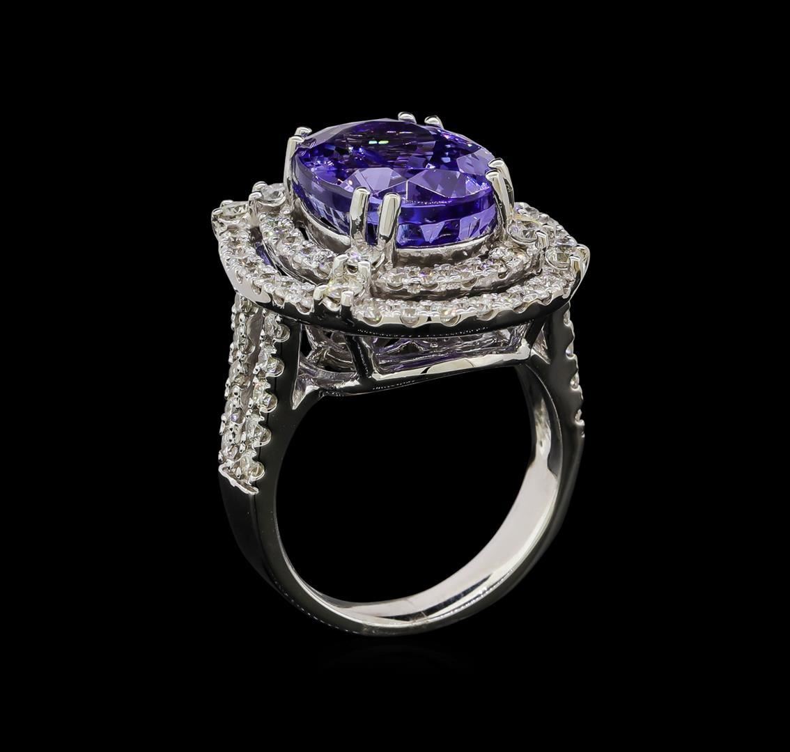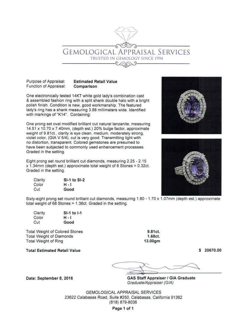 One electronically tested 14KT white gold lady's combination cast & assembled fashion ring with a split shank double halo with a bright polish finish. The featured lady's ring has a shank measuring 3.88 millimeters wide. Identified with markings of 'K14'. Condition is new, good workmanship. Containing: One prong set oval modified brilliant cut natural tanzanite, measuring 14.51 x 10.70 x 7.40mm, (depth est.) 20%. bulge factor, approximate weight of 9.81ct., clarity is eye clean, medium, moderately strong, violet color, (GIA V 5/4), cut is very good. Transmitting light with no distortion, transparent. Colored gemstones are presumed to have been subjected to commonly used enhancement processes. Graded in the setting. Eight prong set round brilliant cut diamonds, measuring 2.25 - 2.15 x 1.34mm (depth est.) approximate total weight of 8 Stones = 0.32ct. Graded in the setting. Clarity SI-1 to SI-2. Color: H - I Cut Good Sixty-Eight prong set round brilliant cut diamonds, measuring 1.80 - 1.70 x 1.07mm (depth est.) approximate total weight of 68 Stones = 1.36ct. Graded in the setting. Clarity SI-1 to I-1. Color: H - I Cut Good. Total Weight of Colored Stones 9.81ct.. Total Weight of Diamonds 1.68ct.. Total Weight of Ring 13.00gm GAS Appraised.