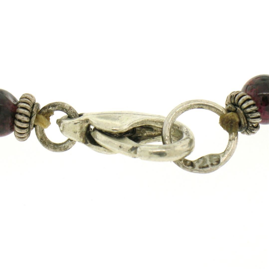One Vintage .950 Sterling Silver 17" Strung Multi Strand 230 Garnet Bead Necklace. Item Details: Material: Solid .950 Sterling Silver w/ .925 Sterling Silver Clasp, Weight: 63.5 Grams, Stone(s): (2) Natural Genuine Garnet - Oval Cabochon Cut - Bezel Set - Rich Burgundy Color - 8.3x6.4mm (approx.), (230) Natural Genuine Garnet - Spherical Shape - Strung Drilled Beads - Rich Burgundy Color - 3.65 to 4.9mm Diameter (approx.), Chain Type: Multi-Strand String w/ Large Statement Sections and Silver Bead Accents, Chain Length: 17 Inches, Clasp: Lobster Claw, Width: 28.57mm at the statement sections Thickness: 8.86mm at the statement sections Condition: Vintage piece. Shows some signs of tarnish. Excellent overall condition!