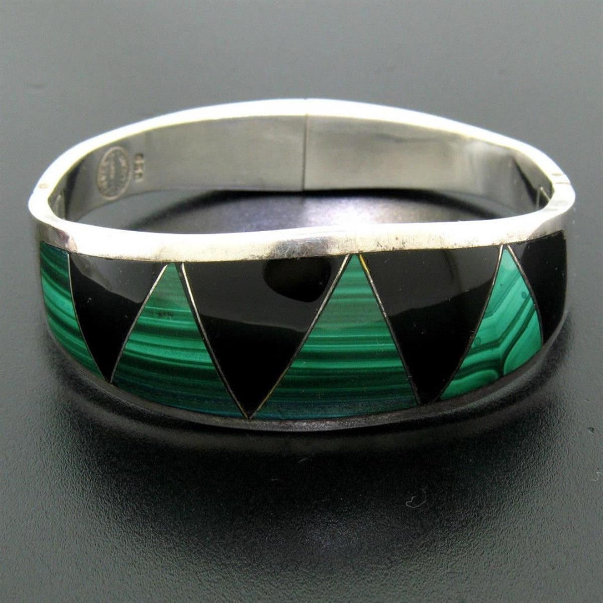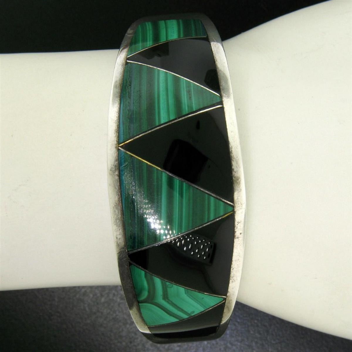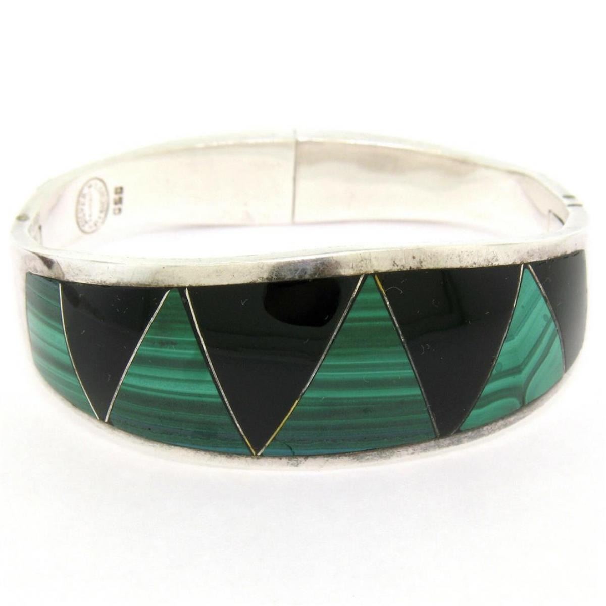 One Vintage .950 Mexican Taxco Silver Designers Malachite & Black Onyx Inlay Bangle Bracelet. Item Details: Material: Solid .950 Silver, Weight: 56.01 Grams, Stone(s): (4) Natural Genuine Malachite - Inlaid Set - Beautiful Banded Green Colors, (4) Natural Genuine Onyx - Inlaid Set - Pure Black Color, Type: Dual-Hinged Open Bangle, Size: Will fit up to a 6.5 inch wrist, Clasp: Box Clasp, Width: 23.88mm (at its widest) Thickness: 5.17mm rise off the wrist. Condition: Vintage hand made piece. Shows a bit of wear. Excellent overall condition!