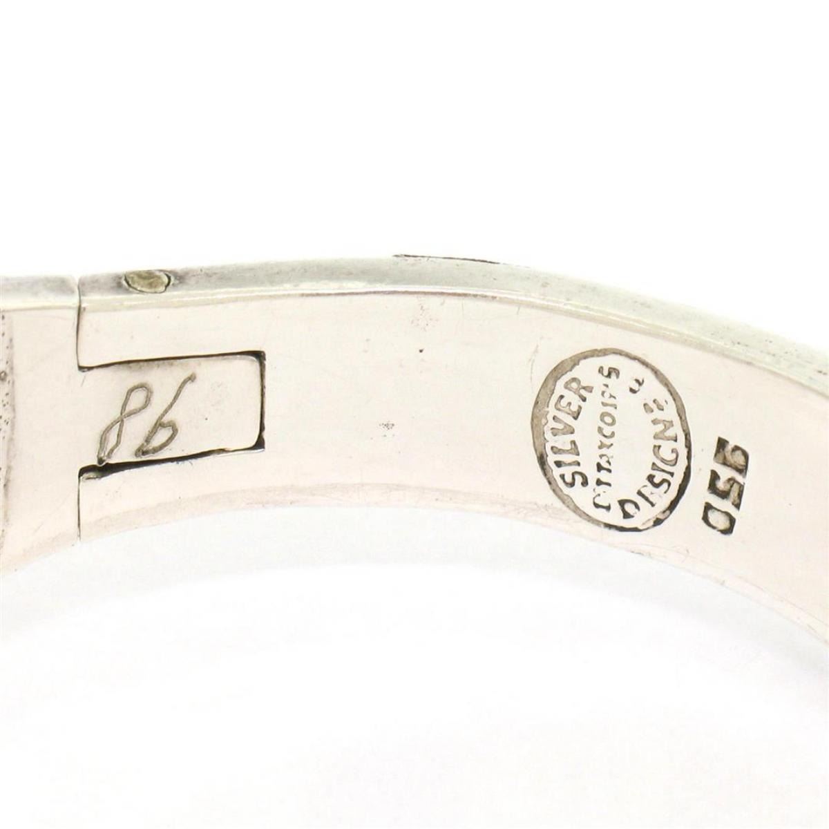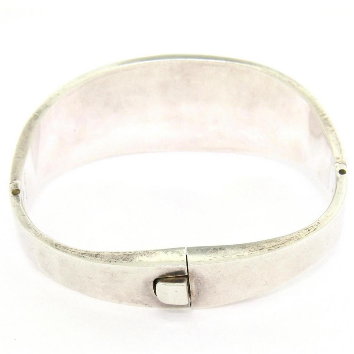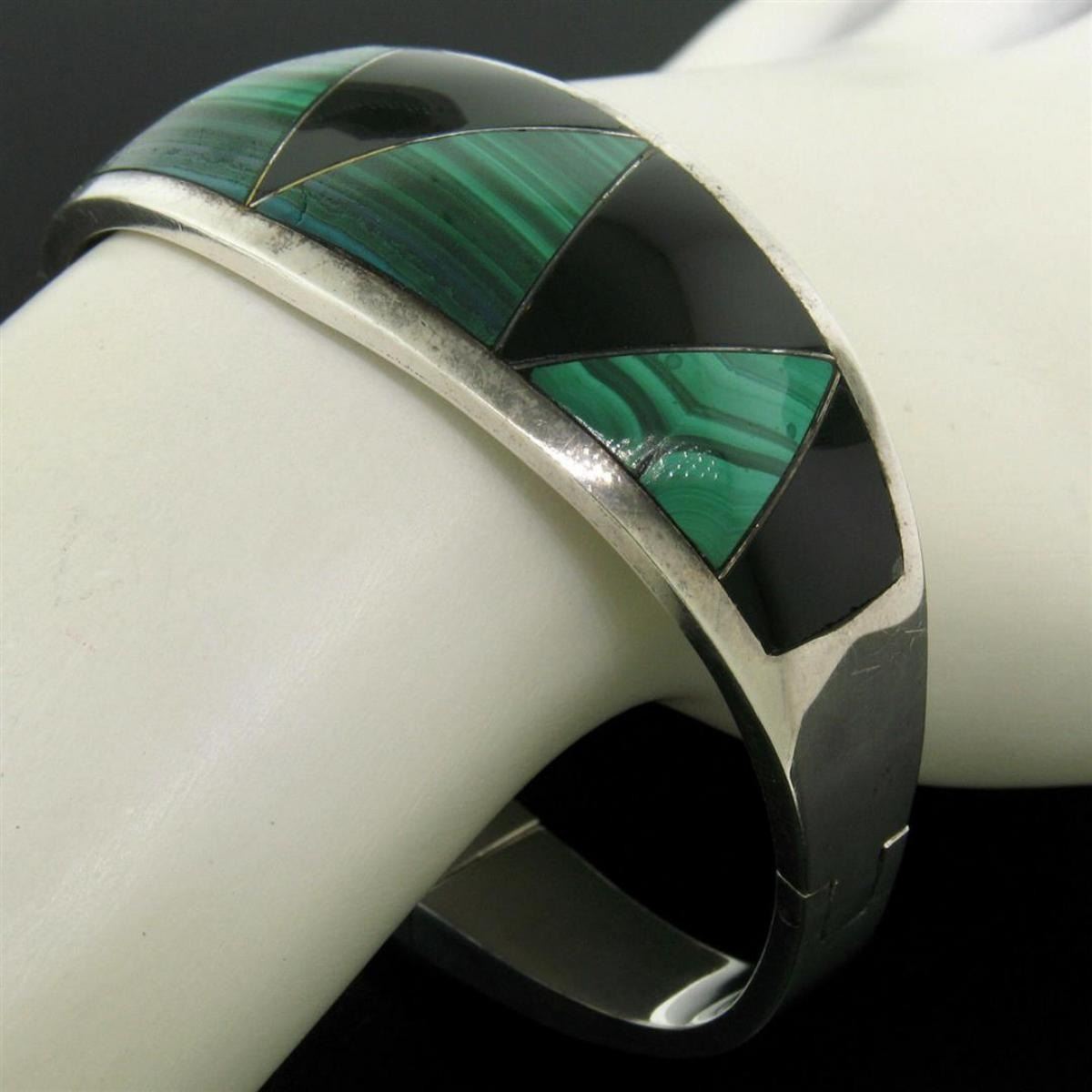 One Vintage .950 Mexican Taxco Silver Designers Malachite & Black Onyx Inlay Bangle Bracelet. Item Details: Material: Solid .950 Silver, Weight: 56.01 Grams, Stone(s): (4) Natural Genuine Malachite - Inlaid Set - Beautiful Banded Green Colors, (4) Natural Genuine Onyx - Inlaid Set - Pure Black Color, Type: Dual-Hinged Open Bangle, Size: Will fit up to a 6.5 inch wrist, Clasp: Box Clasp, Width: 23.88mm (at its widest) Thickness: 5.17mm rise off the wrist. Condition: Vintage hand made piece. Shows a bit of wear. Excellent overall condition!