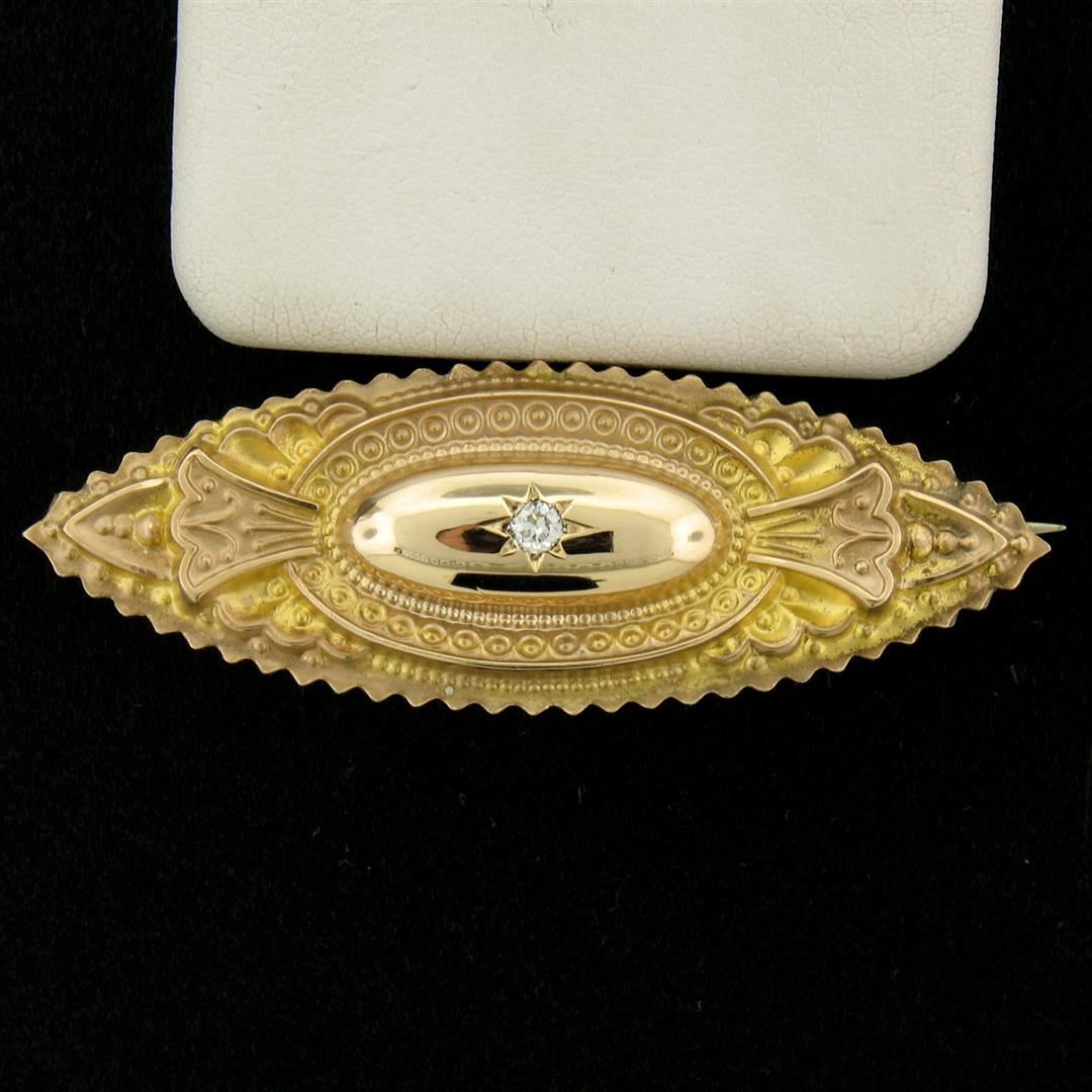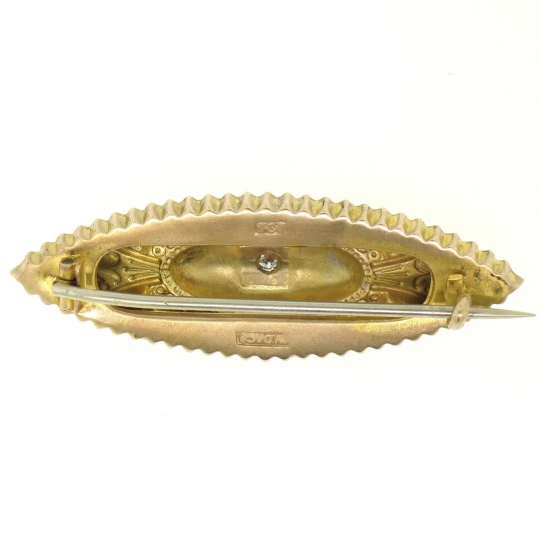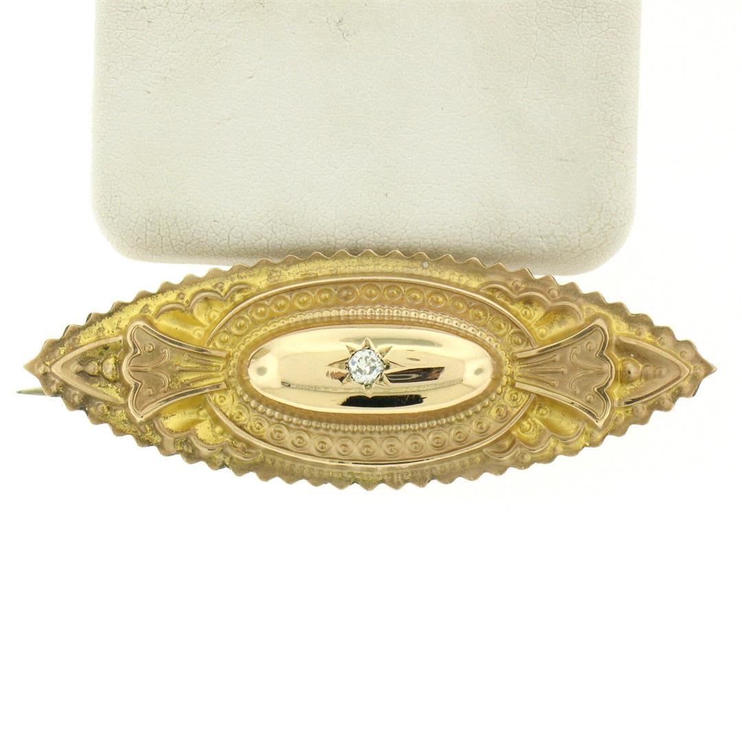 One Antique Victorian 9k Yellow Gold 0.10ct Diamond Marquise Shaped Etched Brooch Pin. Item Details: Material: Solid 9k Yellow Gold, Total Weight: 2.80 Grams, Stone(s): (1) Natural Genuine Diamond - Old Mine Cut - Pavé Set - G Color - VS2 Clarity - 0.10ct (approx.), Overall Height: 16.25mm, Overall Width: 46.5mm, Overall Thickness: 6.3mm, Condition: Antique piece, Excellent Condition!