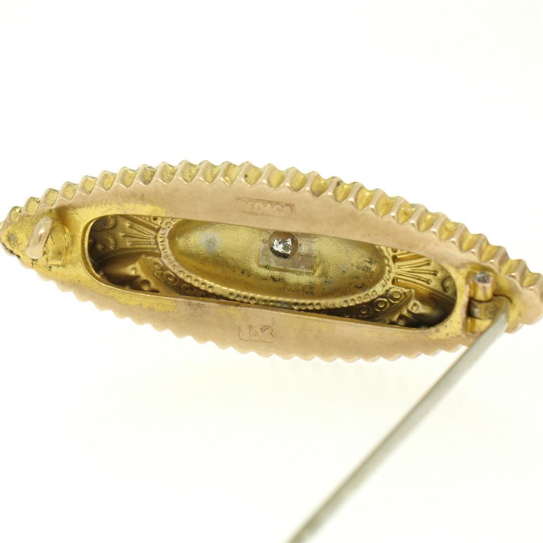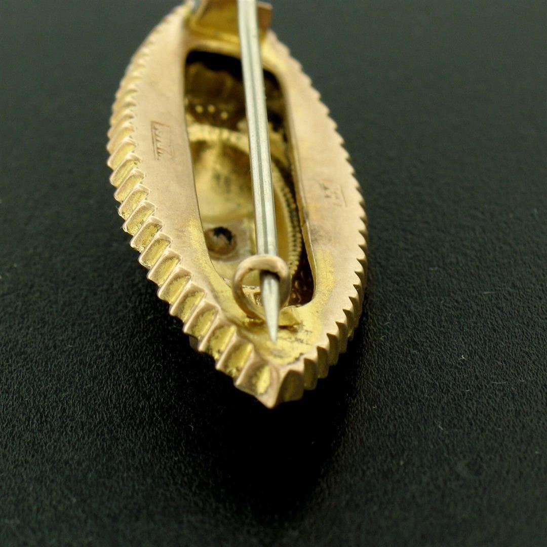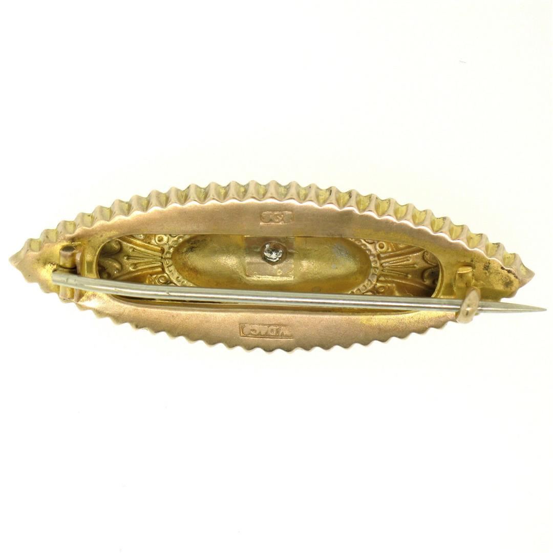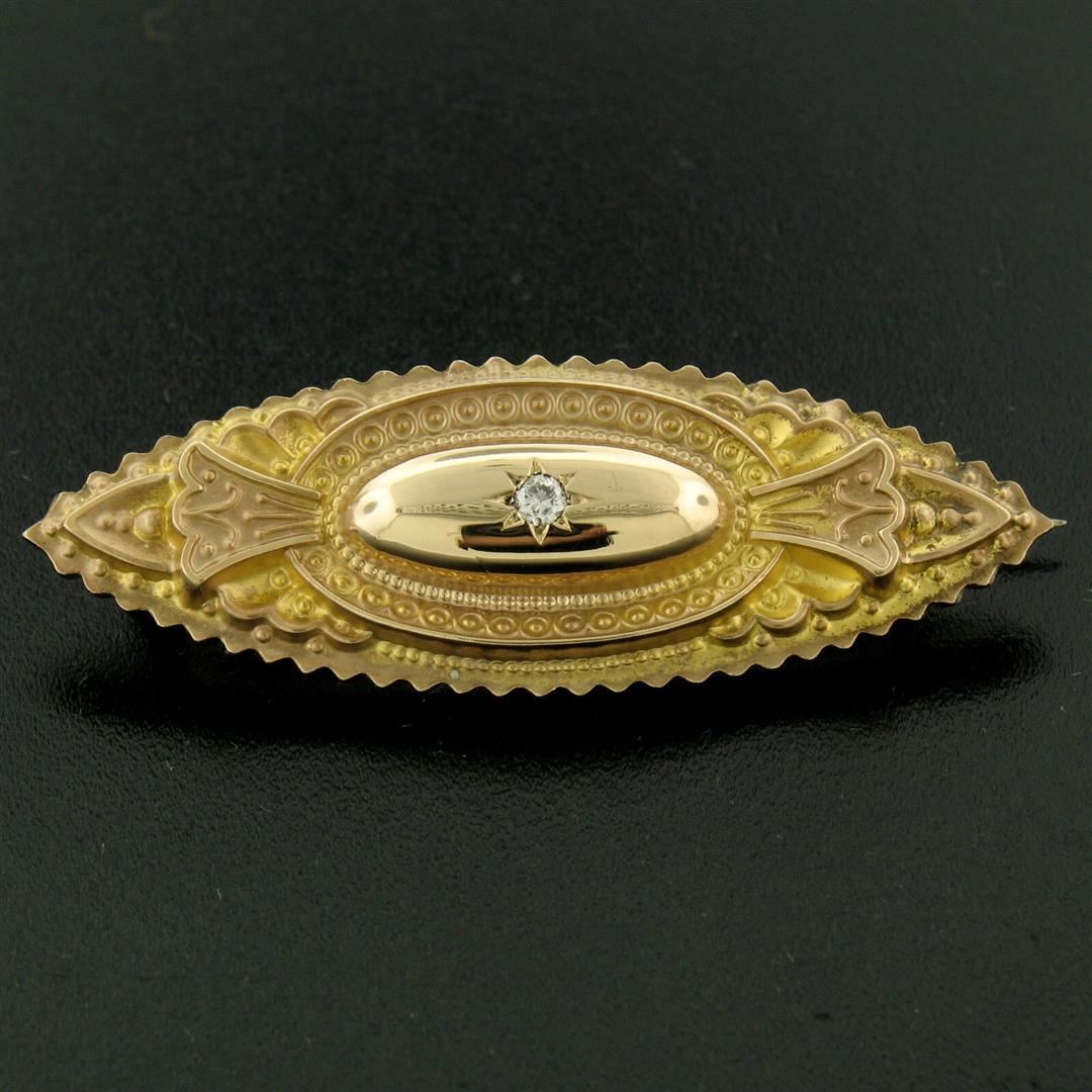 One Antique Victorian 9k Yellow Gold 0.10ct Diamond Marquise Shaped Etched Brooch Pin. Item Details: Material: Solid 9k Yellow Gold, Total Weight: 2.80 Grams, Stone(s): (1) Natural Genuine Diamond - Old Mine Cut - Pavé Set - G Color - VS2 Clarity - 0.10ct (approx.), Overall Height: 16.25mm, Overall Width: 46.5mm, Overall Thickness: 6.3mm, Condition: Antique piece, Excellent Condition!