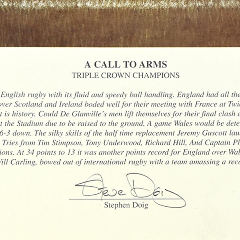"A Call to Arms" is a limited edition lithograph on paper by Stephen Doig, numbered and hand signed by the artist and team members Tony Underwood and Will Carling. This piece celebrates England's 1997 exhilarating win over Wales, 34-13 at Cardiff Arms Park. Measures approx. 26.5" x 29.5" (image). Please note: due to the age of this piece there might be minor imperfections in the white border area or corners of the paper.