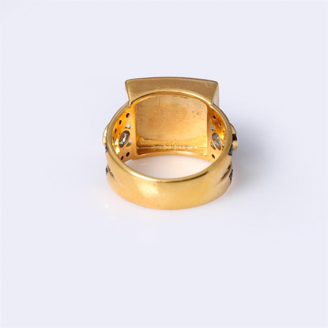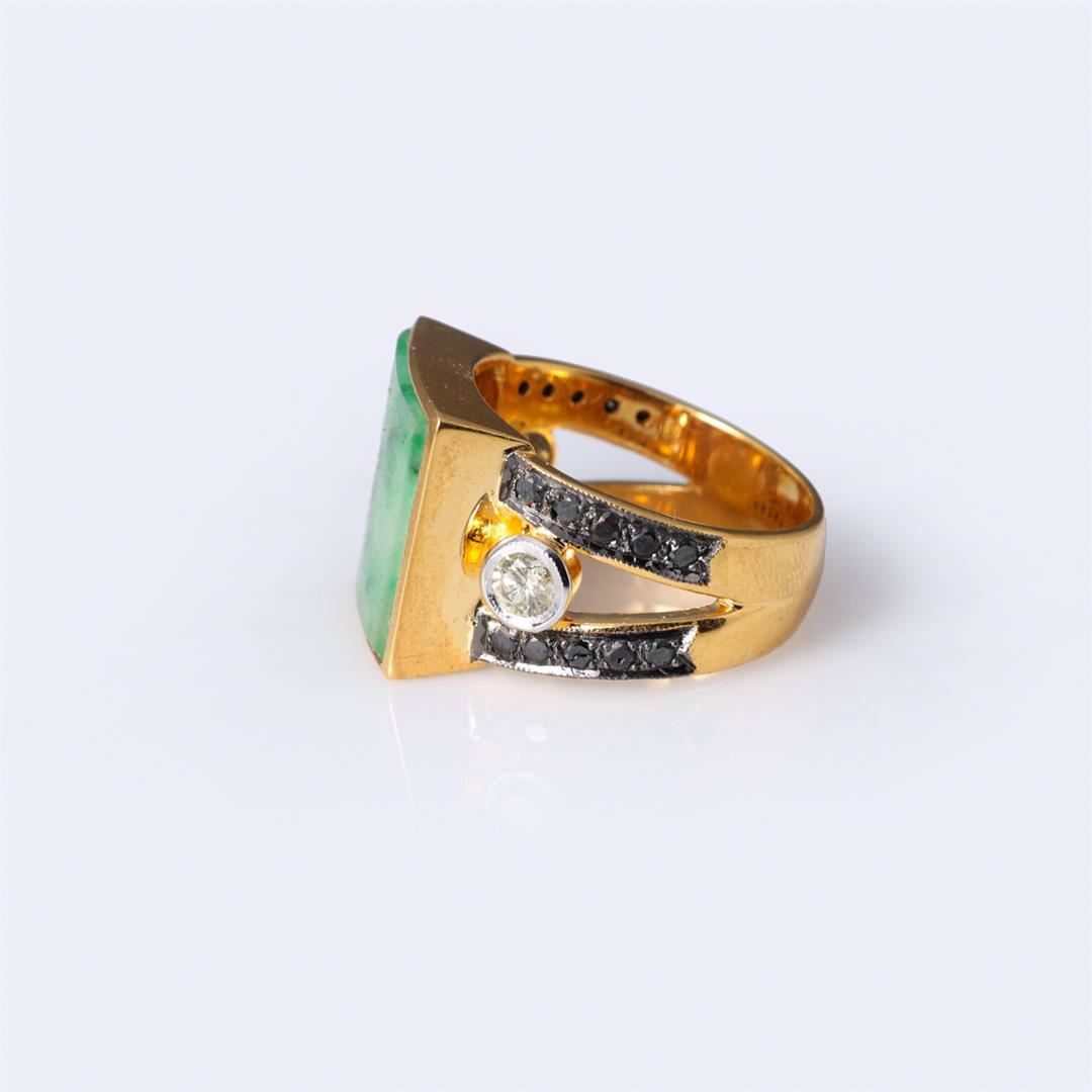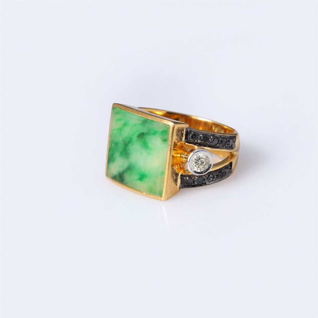 18k Yellow Gold Fine Multicolored Jadeite & Diamond Ring by Carlo Rici containing 14mm x 13mm jadeite with two round brilliant cut diamonds weighing 0.30 cts and twenty round brilliant black diamonds weighing approximately 0.40 cts. Total weight of ring i