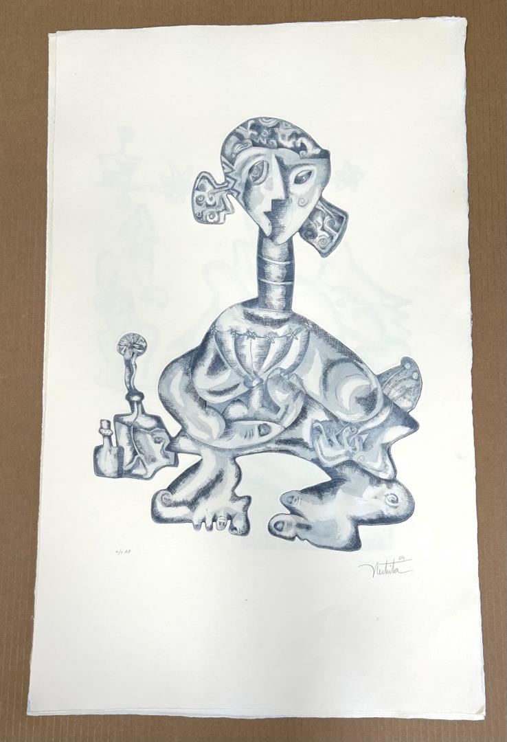 A Nechita figurative etching in blue ink on rag paper. Paper 34x21" Image and size abstracted. AP6/7.