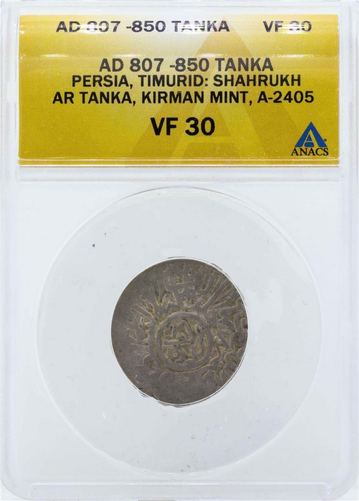 One AD 807-850 Persia Tanka Timurid Kirman Mint Coin ANACS VF30. ANACS Appraised.