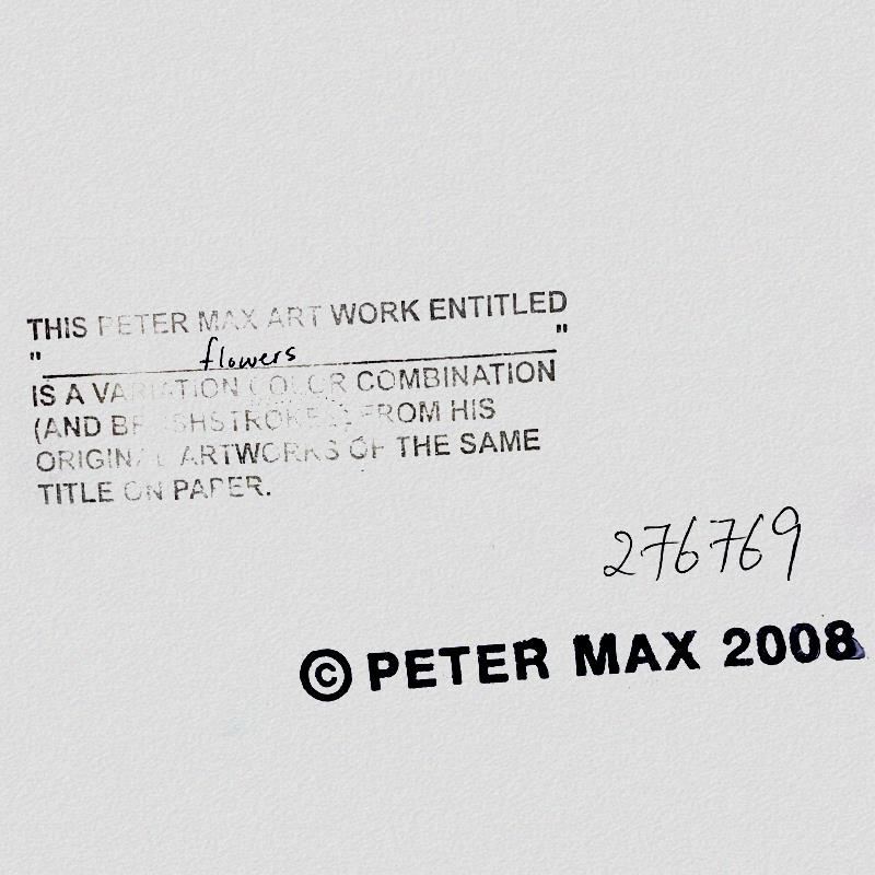 "Abstract Flower" is a one-of-a-kind mixed media on paper, hand signed by Peter Max. The piece comes custom framed with a backside cutout to display Peter Max Studio registration number 276769 certifying authenticity. Measures approximately 42" x 30" (frame), 36" x 24" (image).