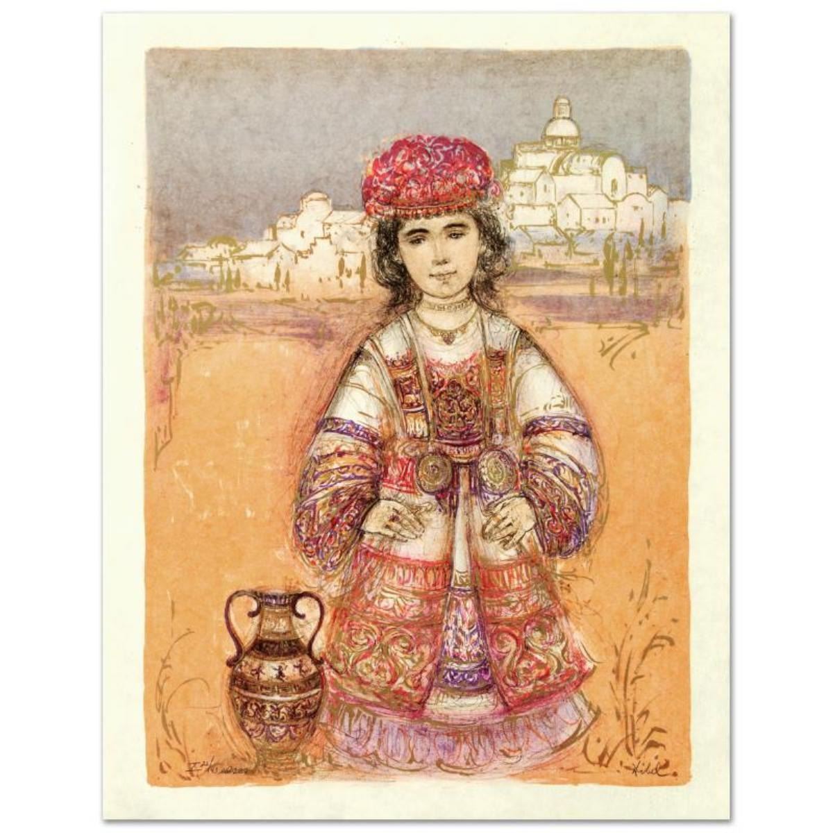 "Aegea" is a limited edition lithograph on rice paper, numbered and hand signed by Edna Hibel (1917-2014). Includes Certificate of Authenticity! Measures approx. 19.5" x 25.5" (with border), 17" x 23" (image).