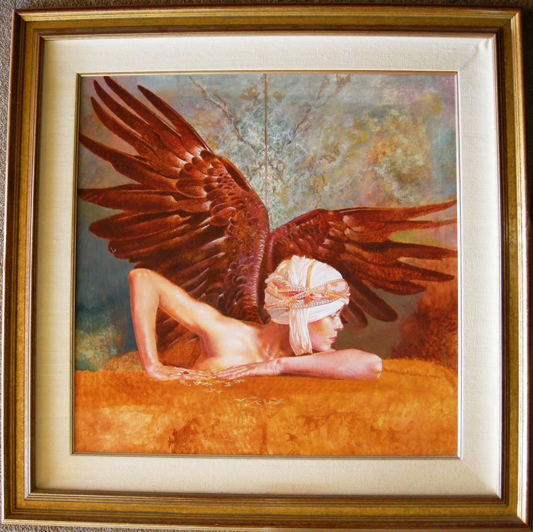 World-renowned Italian artist, Angelo Vadala, demonstrates his unique symbolic style of a girl with wings in this oil on canvas. The painting measures 31 x 31; framed image measures approx. 43 x 43.