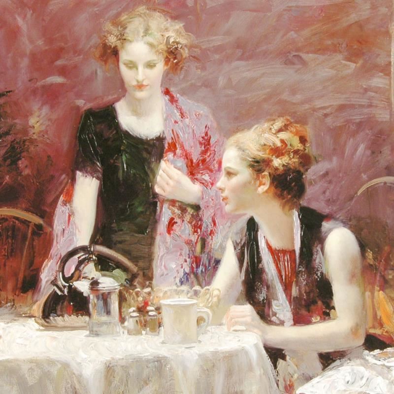 "After Dinner" is a limited edition giclee on canvas by Pino (1931-2010), numbered and hand signed by the artist. Includes Certificate of Authenticity. Measures approx. 12" x 14" (image).