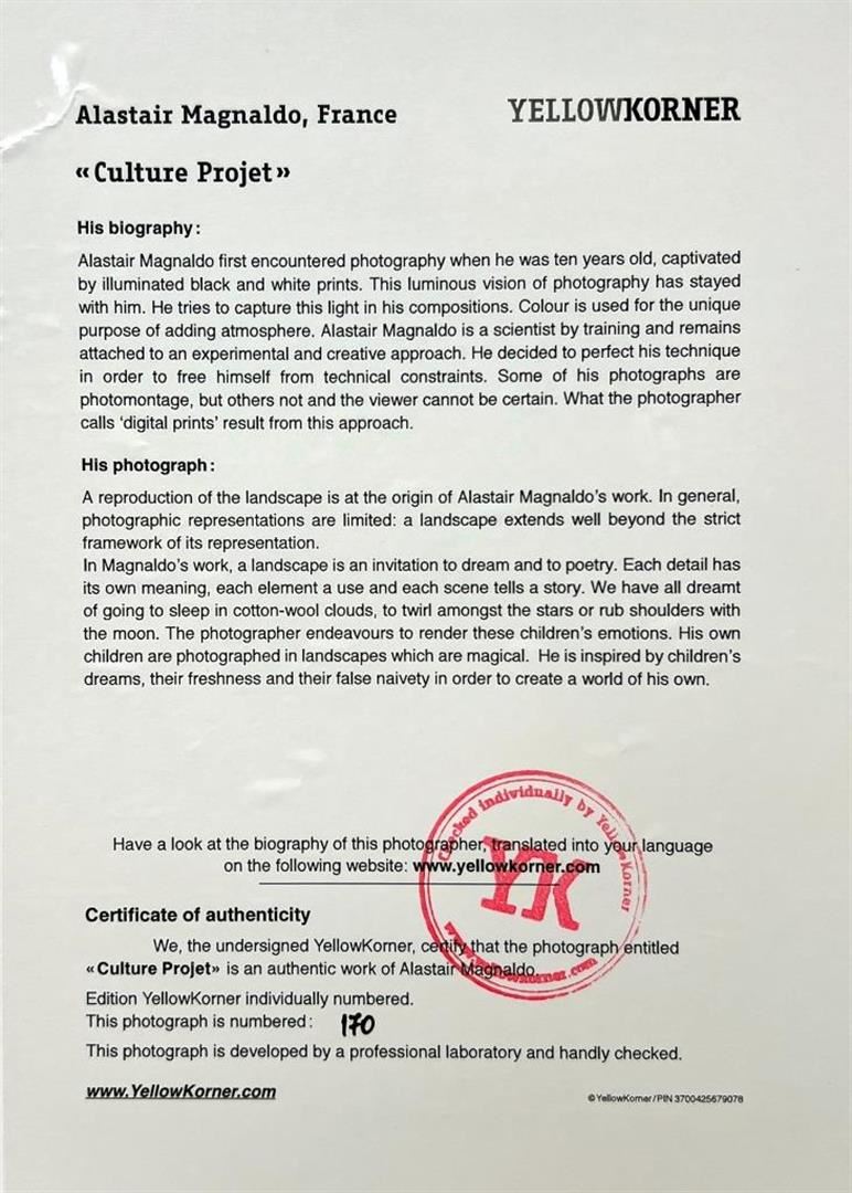 Alastair Magnaldo France Culture Projet YellowKorner Certified Photograph. Certificate of Authenticity from YellowKorner affixed to the back. Matted Dimensions 16"x20". Protected with Clear Mylar Sleeve.