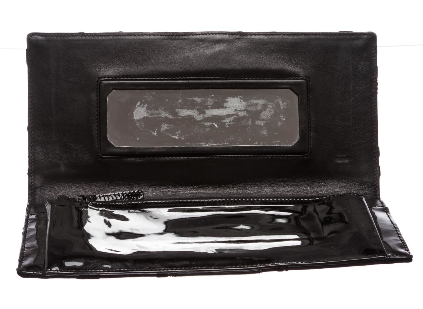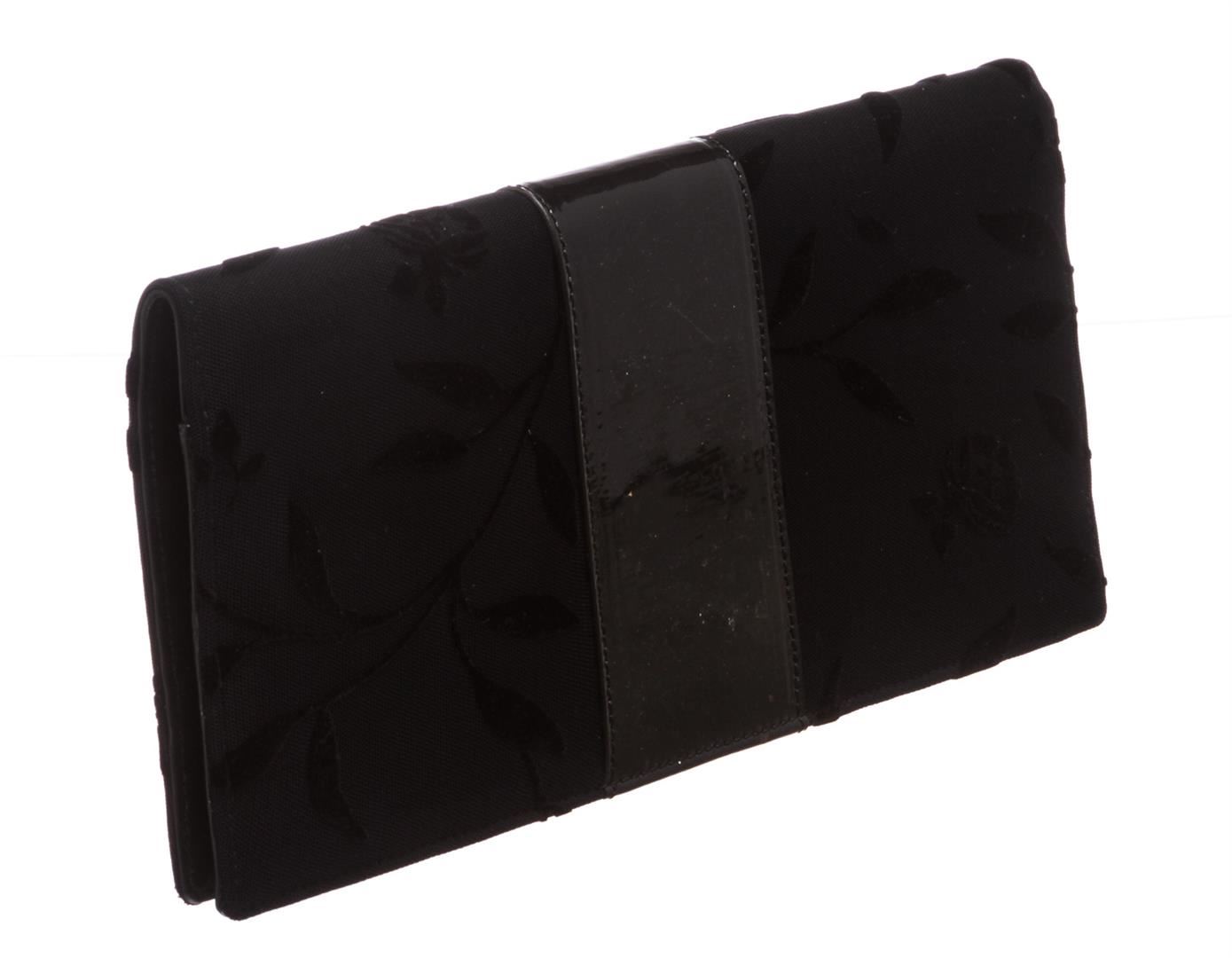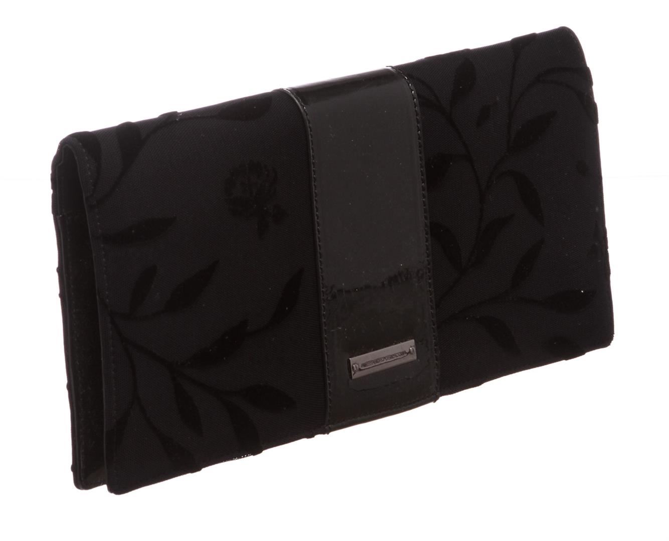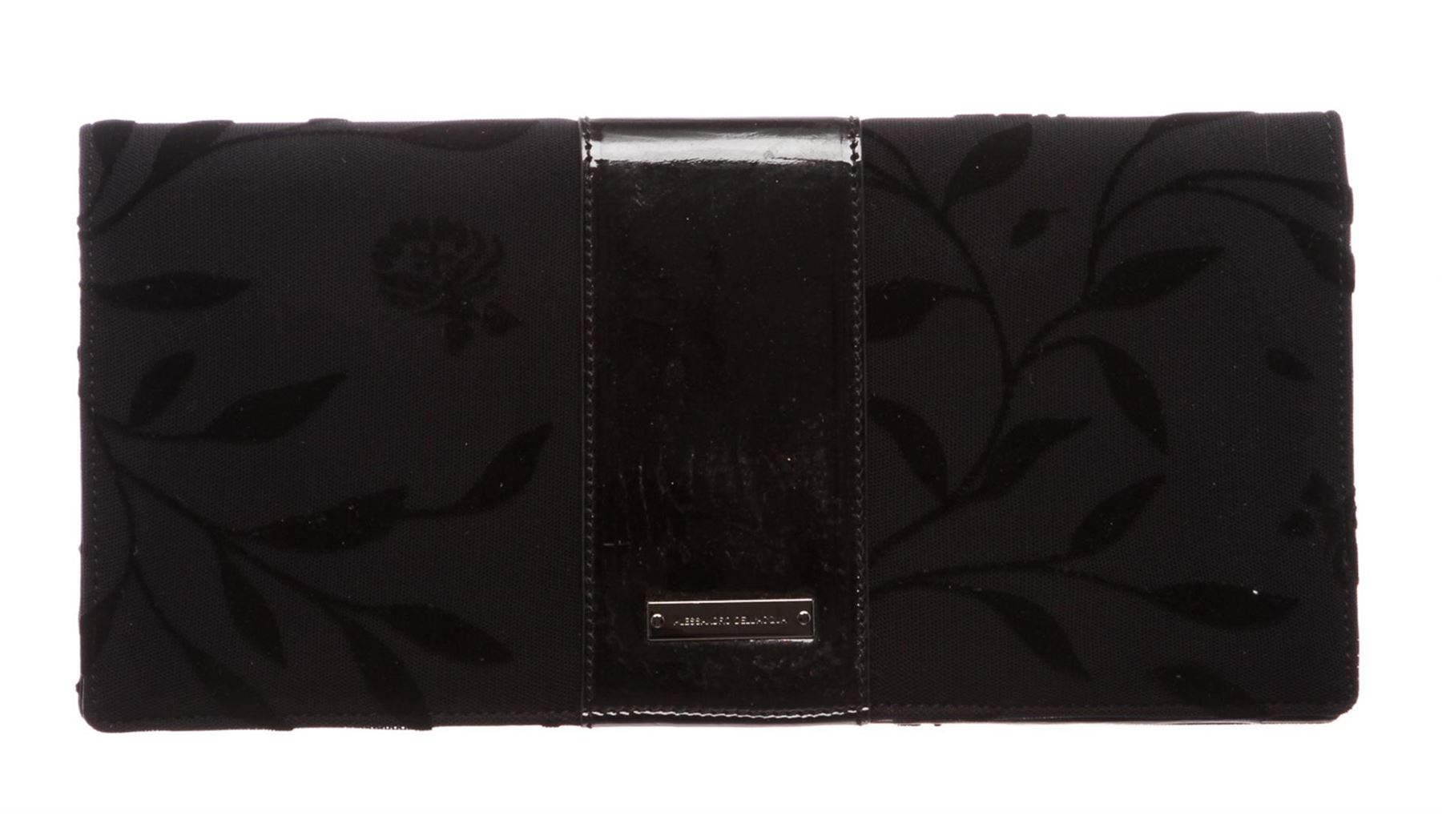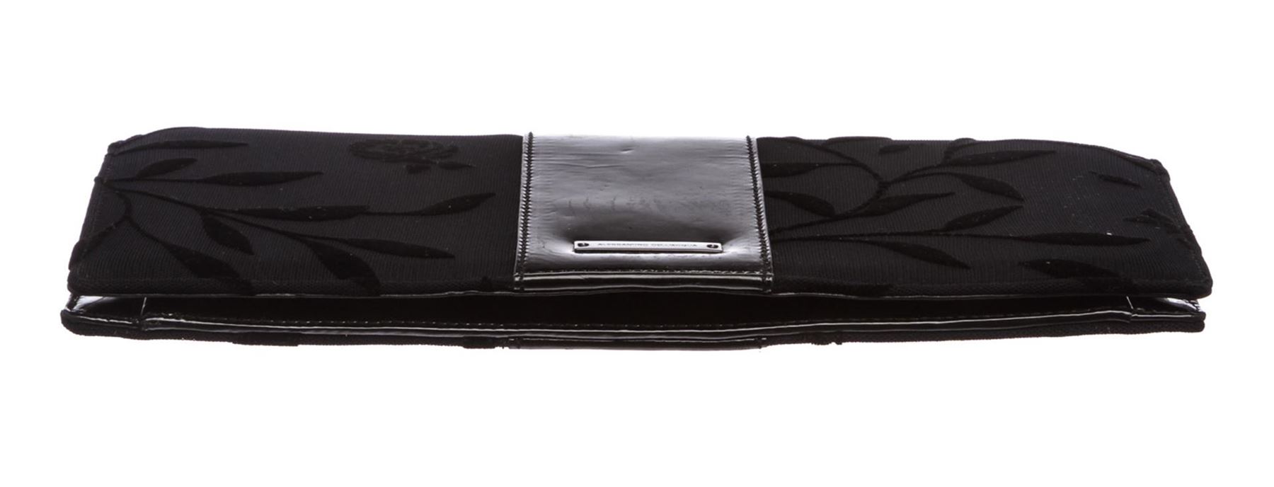 Alessandro Dell'Acqua black floral fabric and patent leather clutch handbag. Inner black leather and patent leather lining, side zip pocket, and mirrored flap.