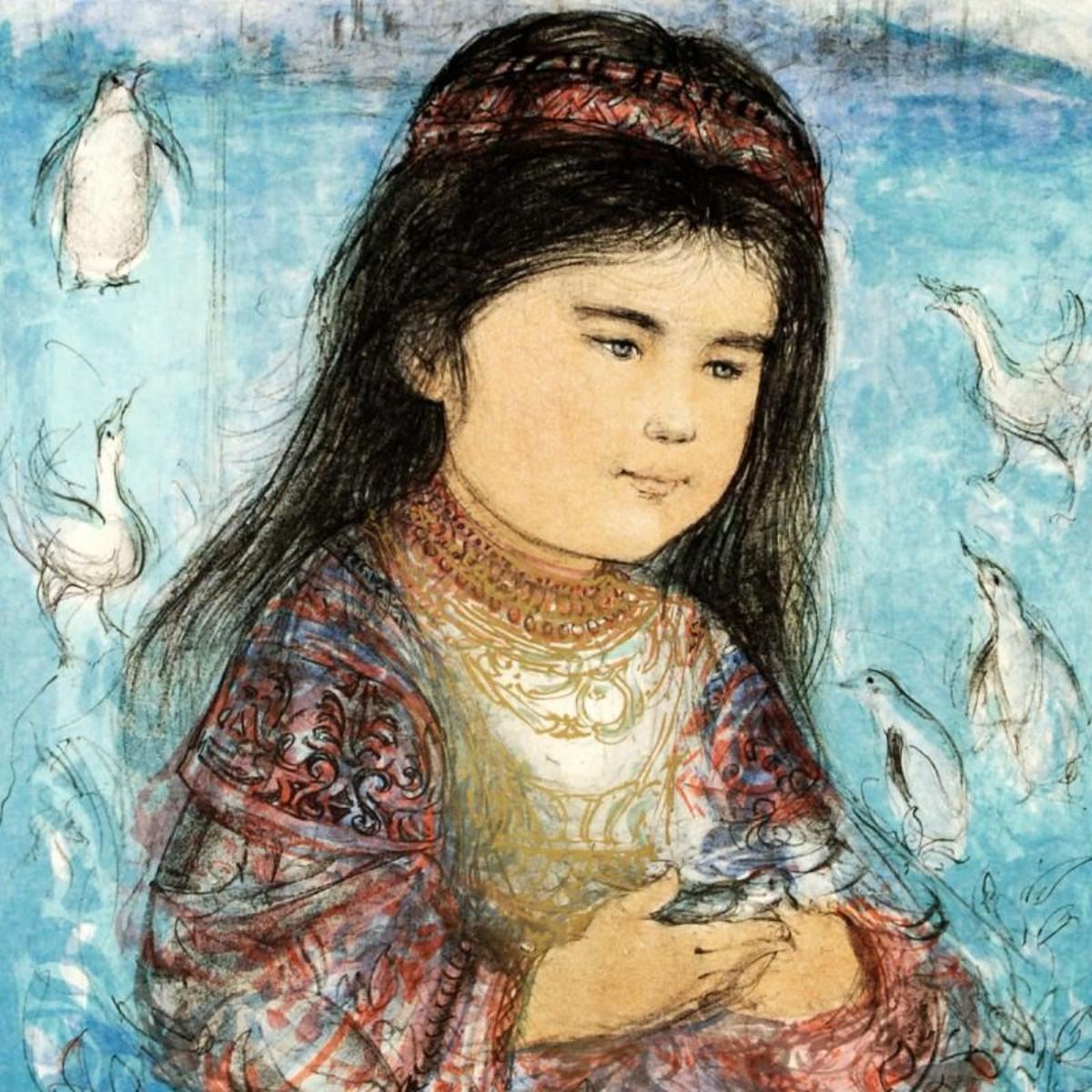 "Aleut Child" is a limited edition lithograph on rice paper, numbered and hand signed by Edna Hibel (1917-2014). Includes Certificate of Authenticity! Measures approx. 20" x 26.5" (with border), 14" x 17.5" (image).