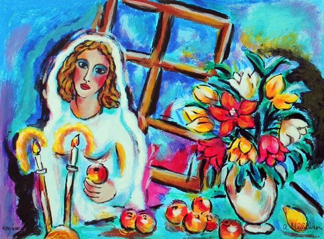 Artist: Alex Meilichson - Title: Glowing Candles - Medium: Serigraph on Fine Art Paper - Signature: Hand-signed by the Artist - Limited Edition: 450 - Image Size: 9 inches x 12 inches - Paper Size: Approximately 10.5 inches x 13.5 inches - Unframed - Details: This work comes with a Certificate of Authenticity - Alex Meilichson has developed a figurative style, using a palette of brilliant colors. His favorite media are ink, acrylic and oil on canvas. He paints Judaic themes, landscapes and still life in an expressionist 'Ecole de Paris' approach. -