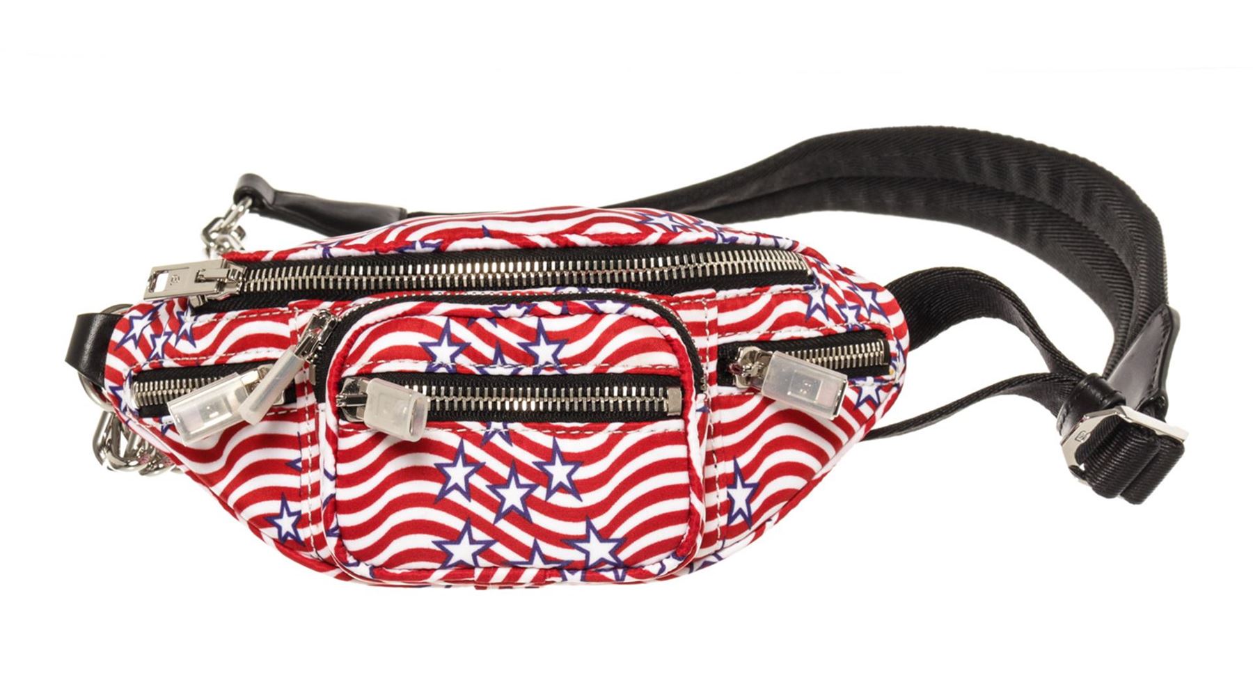 One Alexander Wang Red Monogram Nylon Attica Waist Bag. Item is sold AS-IS. All available information is listed in the description and shown in the photo. Red printed monogram nylon Alexander Wang Attica waist bag with silver-tone hardware, black leather trim, adjustable waist strap, three exterior pockets, black nylon lining and zip closure at top. Height: 3.5" Width: 9" Depth: 1.75" Strap Length: 45"